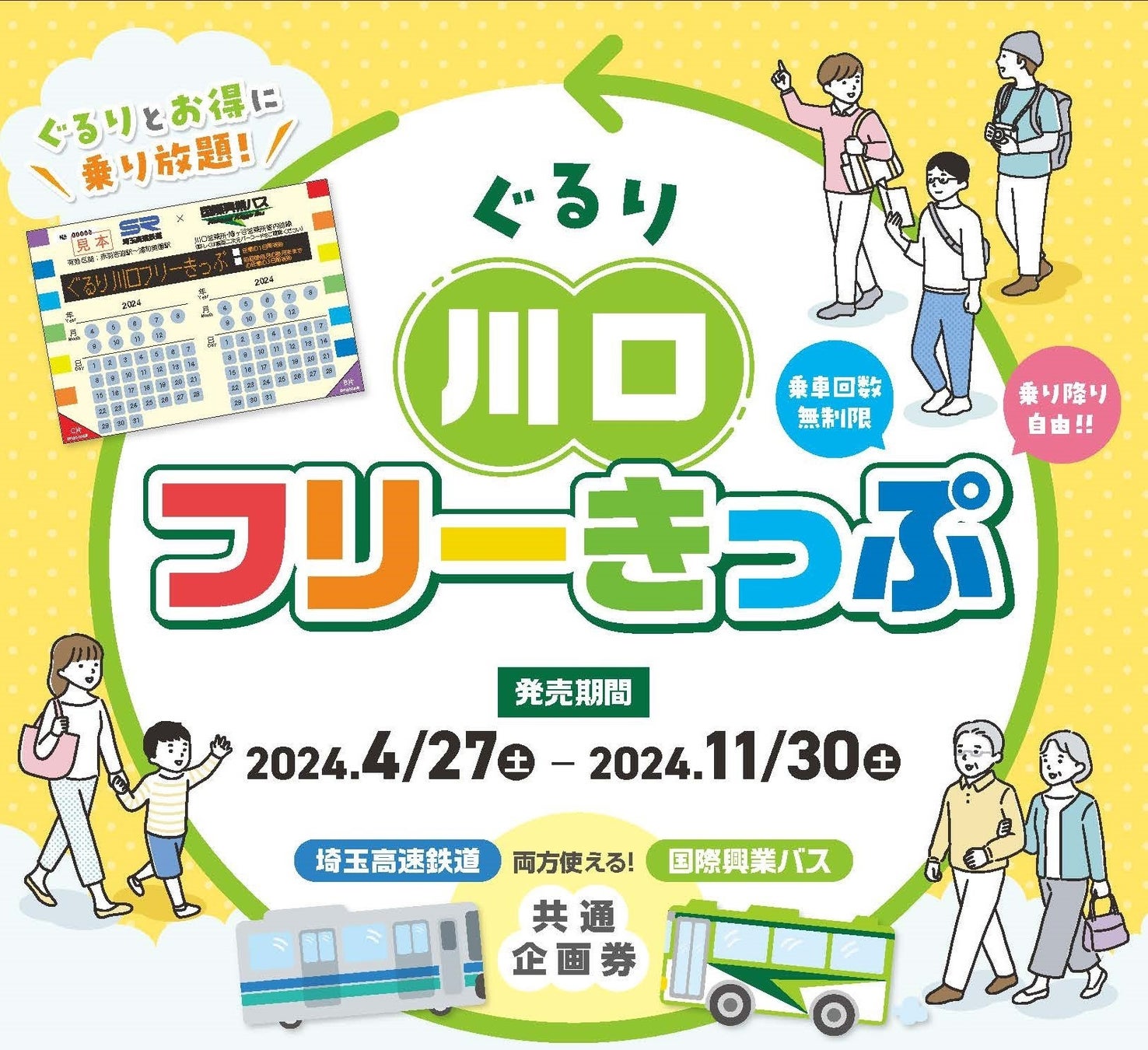 国際興業株式会社(本社:東京都中央区 代表取締役社長 南 正人)、埼玉高速鉄道株式会社(本社:埼玉県さいたま市緑区 代表取締役社長 荻野 洋)は、昨年度発売した「ぐるり川口フリーきっぷ」がたいへんご好評をいただいたことから、ゴールデンウィークの大型連休に合わせ4月27日(土)より第二期販売を行います。