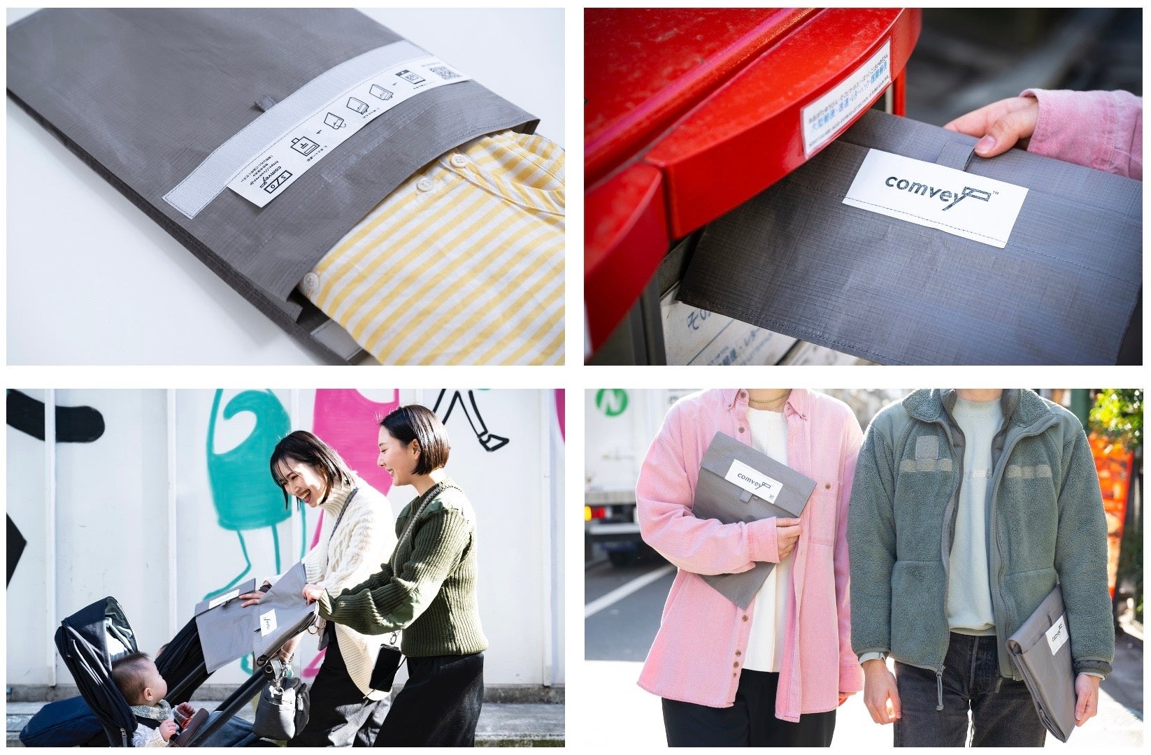 comveyのシステムが導入されたECカートでは、生活者は梱包方法をダンボール等の通常の方法にするかシェアバッグにするかを選択できます。届いたシェアバッグはポストに投函するだけで返却が可能、返却確認ができたら利用者はクーポンを獲得できます。comveyへ返却されたバッグはクリーニング・修繕が施されたのち、再びEC事業者へと提供されます。