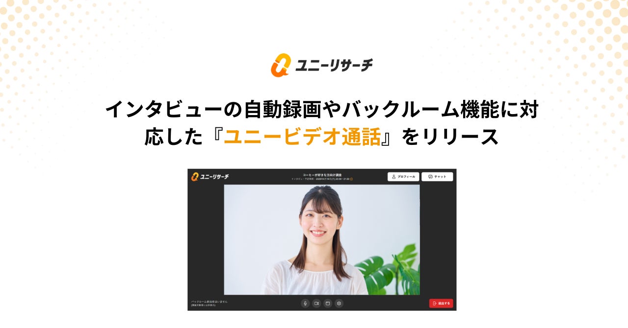 株式会社プロダクトフォース(所在地:東京都渋谷区、代表取締役CEO:浜岡 宏樹 以下 プロダクトフォース)が運営するユーザーインタビュープラットフォーム「ユニーリサーチ」は、インタビューURL発行、自動録画、バックルーム機能に対応した『ユニービデオ通話』を提供開始しました。