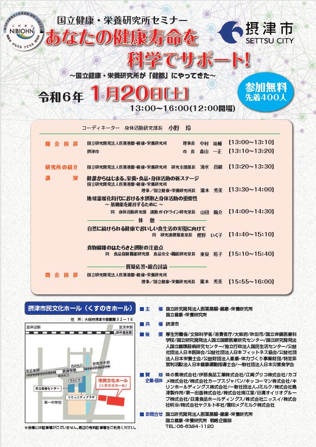 2024年1月20日(土)、国立健康・栄養研究所は摂津市と共催で、摂津市民文化ホール(くすのきホール)において、国立健康・栄養研究所セミナーを開催します。