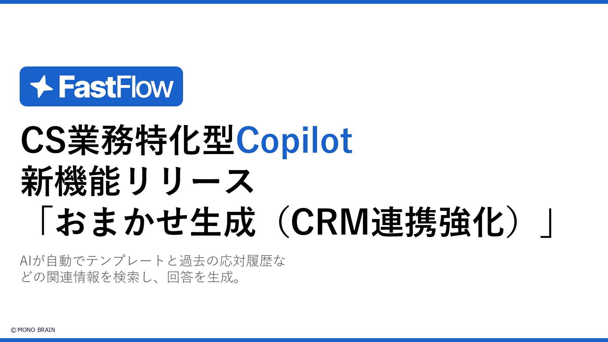株式会社MONO BRAIN(本社:東京都渋谷区、代表取締役:加藤真規)は、CS業務特化型AI Copilot「FastFlow」の中核機能である「おまかせ生成」において、CRM(顧客関係管理)システムとの連携を強化したことをお知らせします。