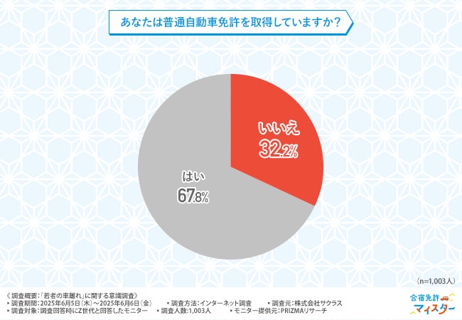 はじめに、「普通自動車免許を取得しているか」と尋ねたところ、『いいえ(32.2%)』と回答した人は約3割にのぼりました。