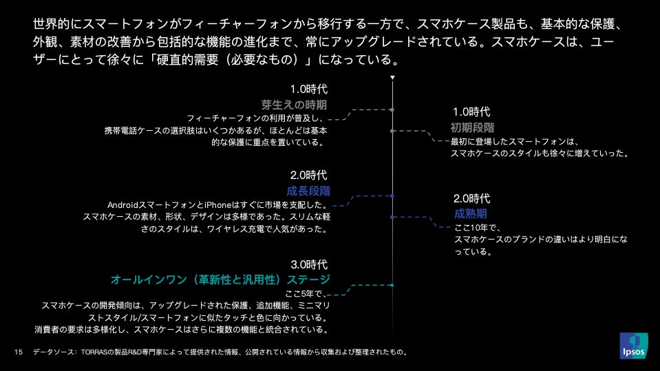 ③スマホの高機能化が進んでおり、利用シーンの多様化に加え、スマホケースは機能と形態も応じて、3つの時代に分けられ進化していきます。そのなか、日本は2.0時代から3.0時代へ移行しています。