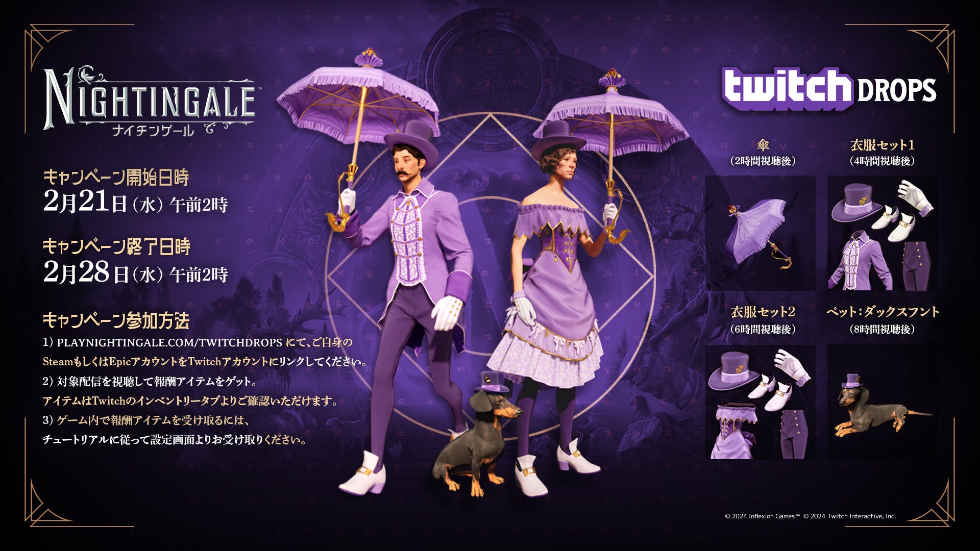 早期アクセス開始となる2月21日の午前2時から28日午前2時までの1週間の間、ライブストリーミング配信プラットフォームTwitchにて「Twitch Dropsキャンペーン」を開催いたします。ご自身のSteamもしくはEpicアカウントをTwitchのアカウントにリンクした上で、参加チャンネルの動画配信を視聴すれば、Twitchのインベントリータブより傘や服装、フェイの境域探索時のお共となってくれるヴィクトリアン・スタイルのダックスフントなどのアイテムをゲットできます。