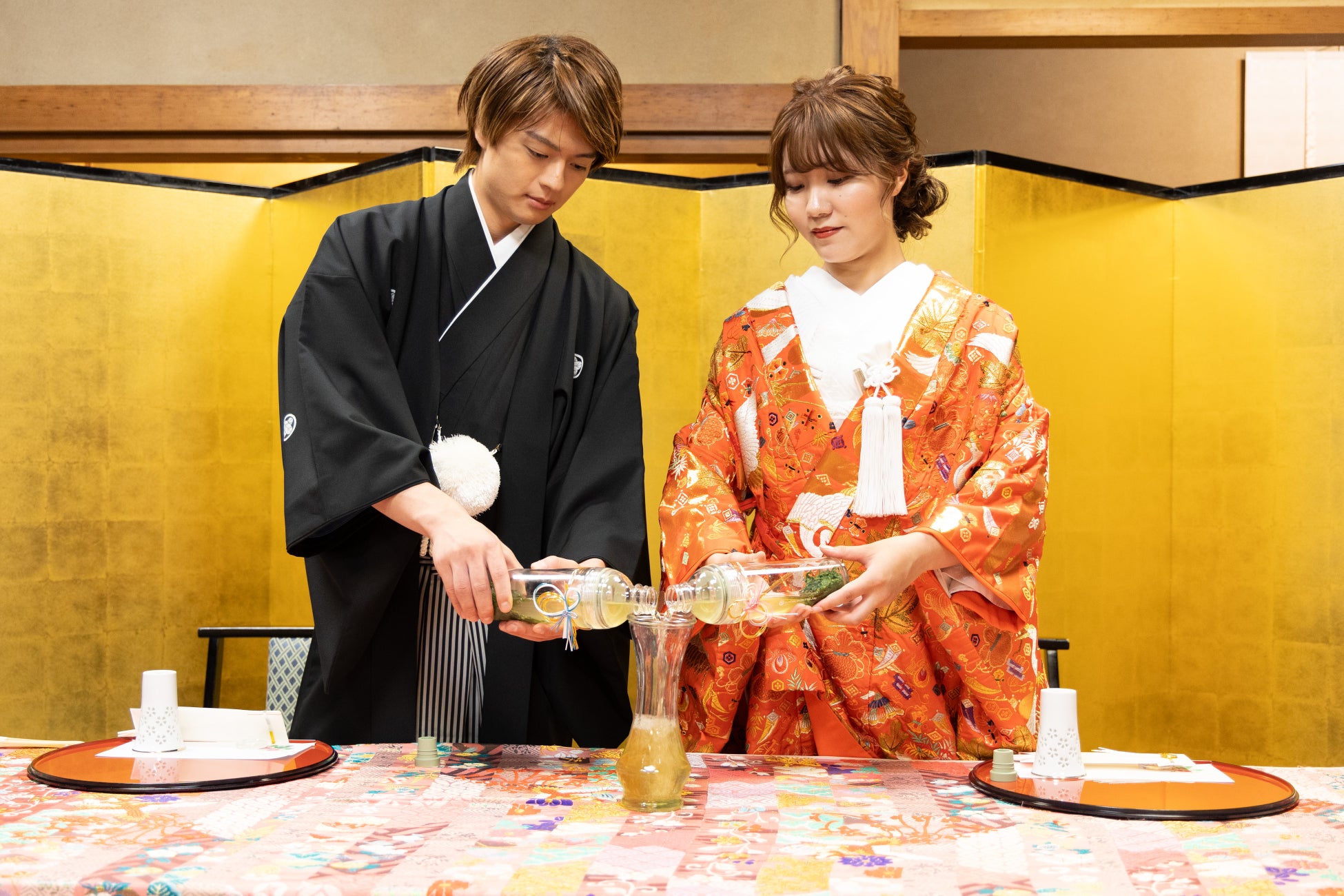 この演出だけの祇園辻利監修のオリジナルブレンド茶葉で、新郎新婦それぞれの個性にあったお茶を選びます。披露宴では、それぞれが選んだお茶を伝統ある⽔だし茶で、新郎新婦の和合を⽰しお茶を注ぎあい、オリジナルのブレンド茶を作成。「祝茶(しゅくちゃ)」の掛け声で列席者⼀同乾杯し、宴席を盛り上げる仕掛けを施しました。