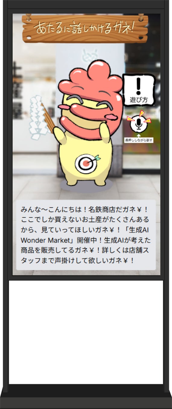 「生成AI Wonder Market」の第3弾として、SpiralAIが名鉄生活創研のキャラクター「らっきぃあたるくん」をモデルに、AI音声対話型アバターを開発し、お客様の呼び込みと生成AIが考案した商品紹介に活用することで、お客様の買い物体験の向上を目指します。