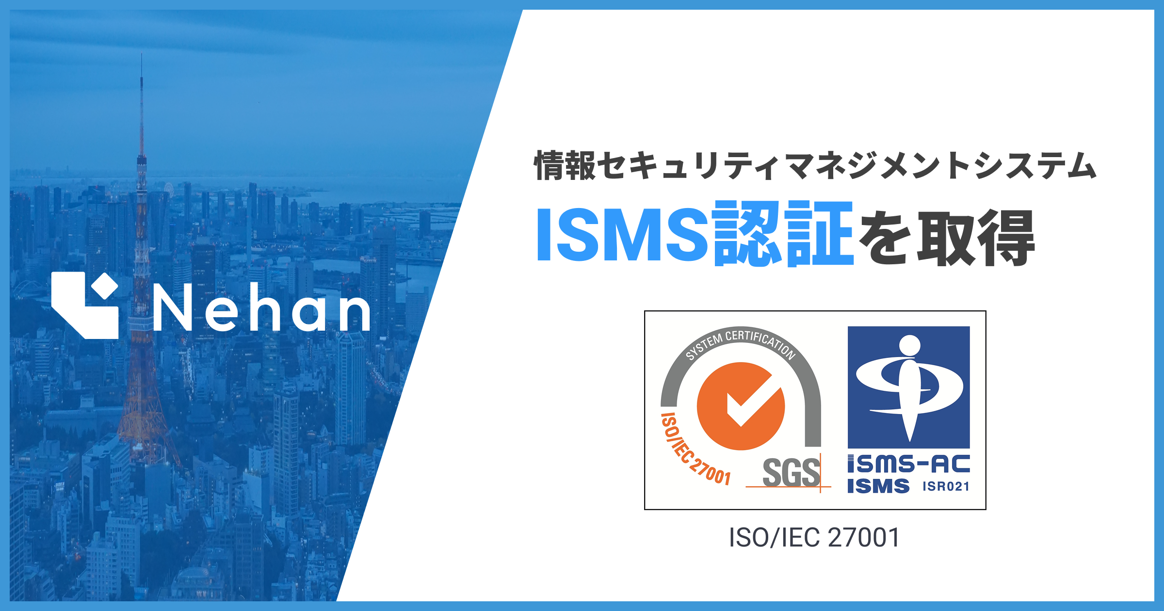Nehan株式会社(本社:東京都新宿区、代表取締役:鶴巻百門・木嶋諄、以下「当社」)は、2026年2月24日付けで情報セキュリティマネジメントシステム(ISMS)の国際規格「ISO/IEC 27001」の認証を取得いたしましたので、お知らせいたします。