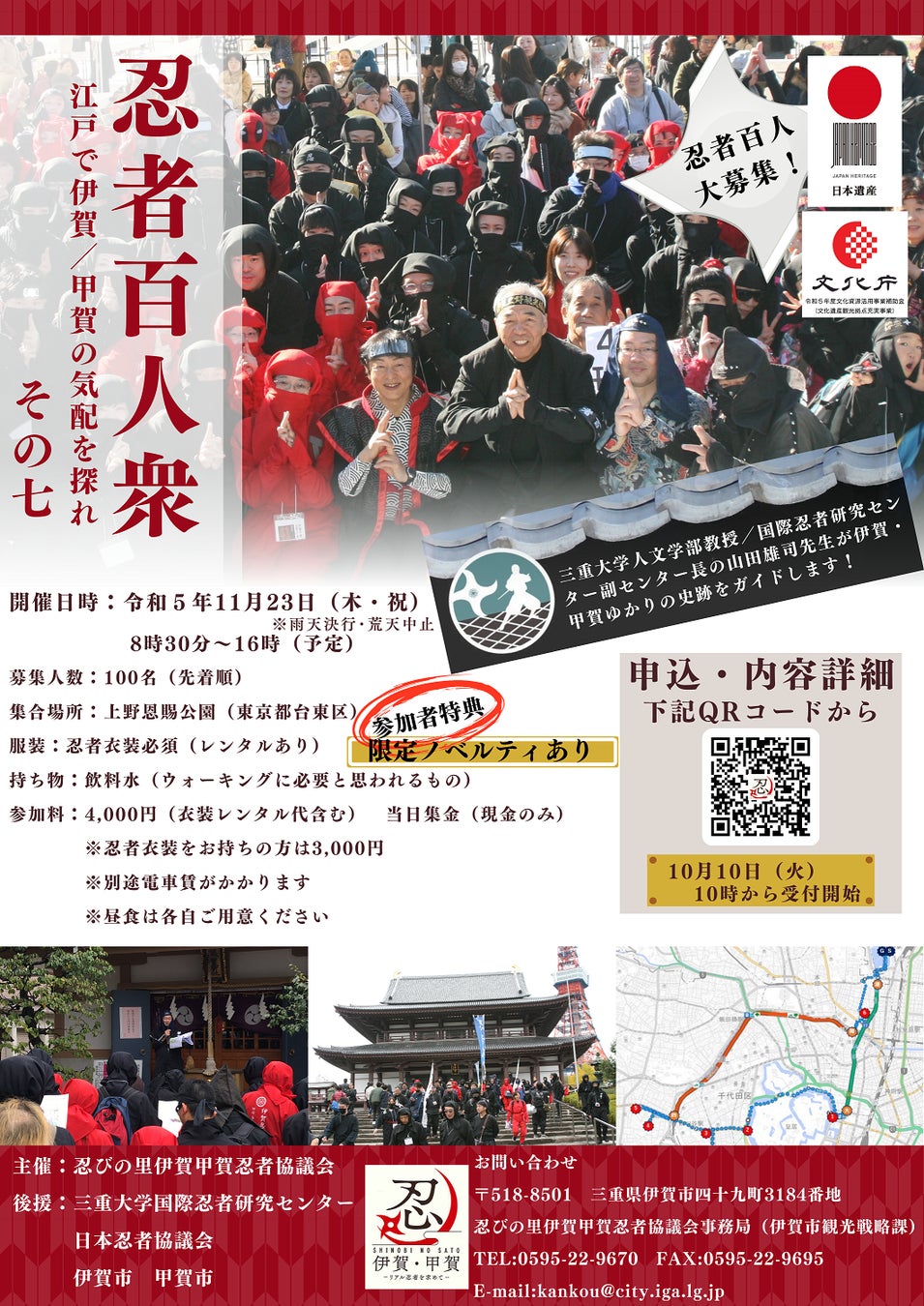 日本遺産の認定地域である忍びの里伊賀甲賀忍者協議会では、11月23日(木・祝)、東京都内で4年振りに「忍者百人衆 江戸で伊賀/甲賀の気配を探れ(その七)」を開催します。