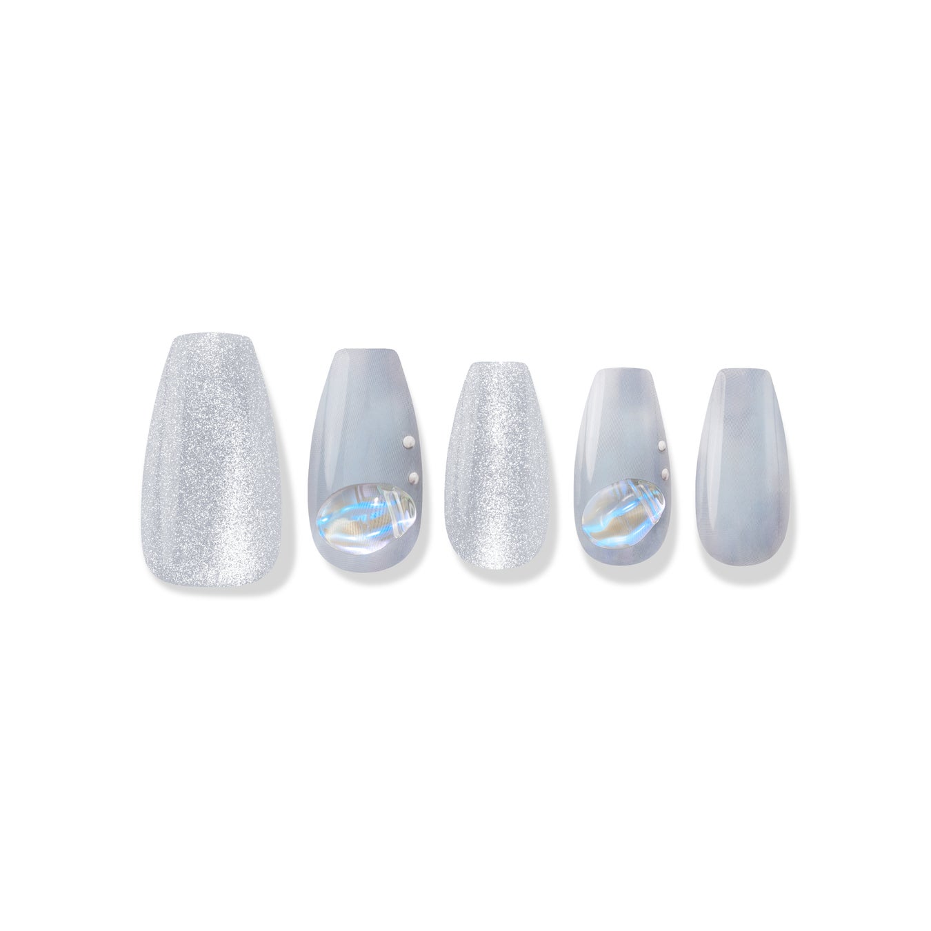 海のキレイな波を表現したネイル。フィンガースーツオリジナルの小石パーツは、ブルーパウダーの光をきらりと放ちます。マグネットジェルがお届けするうっとりとしたムードをお楽しみください。