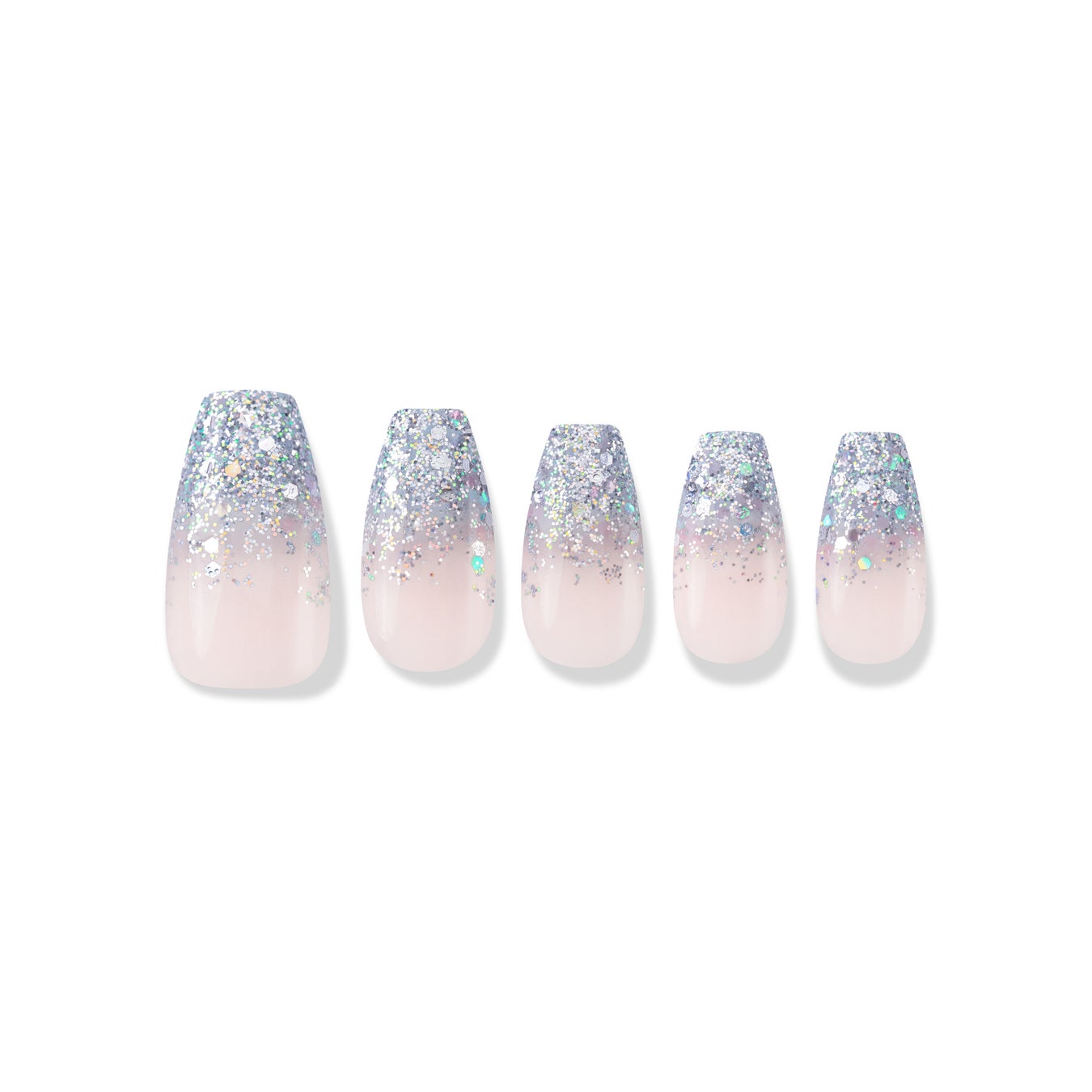空色のシルバーグラデーションに大きさがバラバラのラメをミックスし、華やかさをプラスしたネイル。どの角度からも輝くから気分転換にピッタリ。主人公になったような気分にしてくれるデザインです。