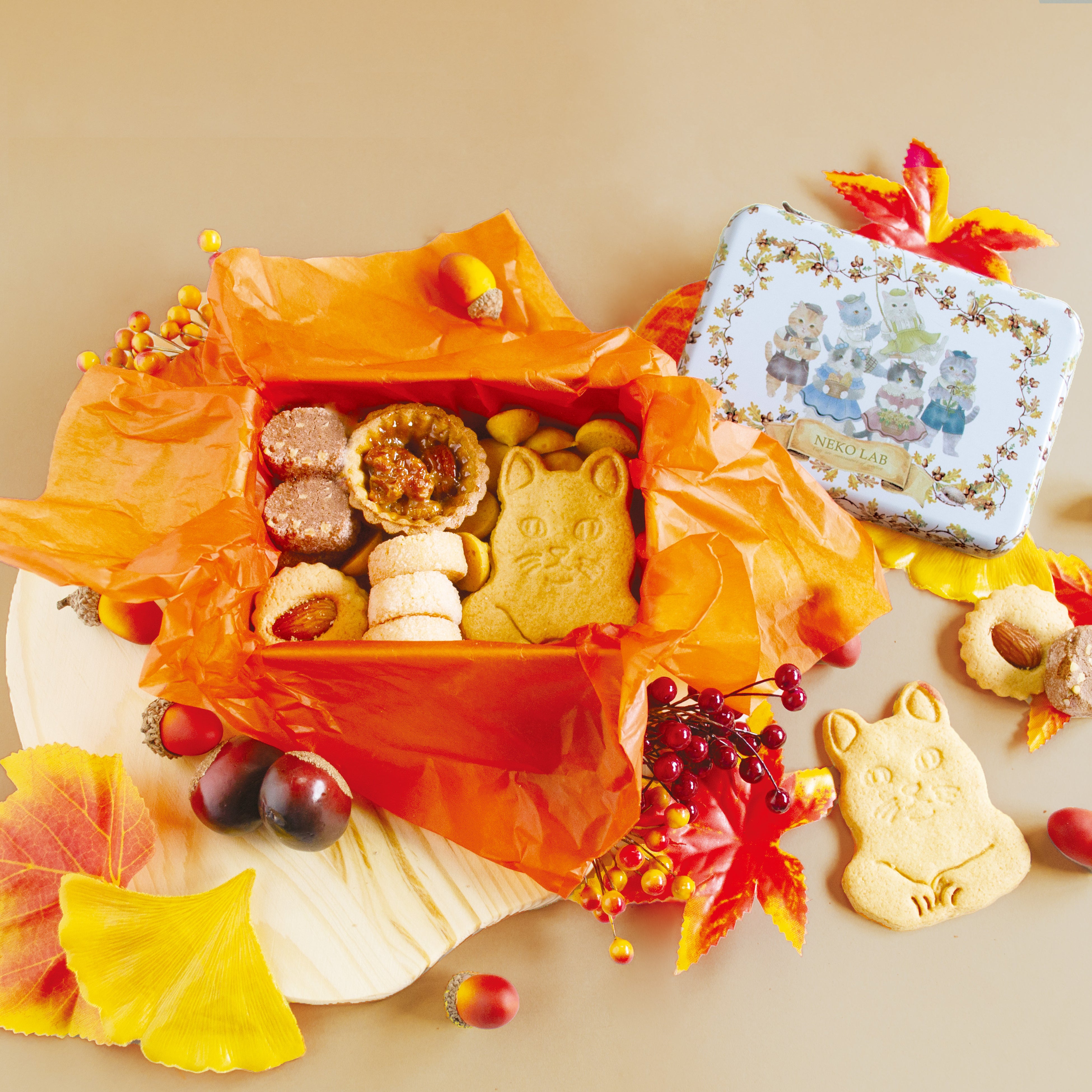 可愛らしい猫たちが描かれた缶の中に秋限定のフロランタンタルトなど、6種のクッキーを詰め合わせました。