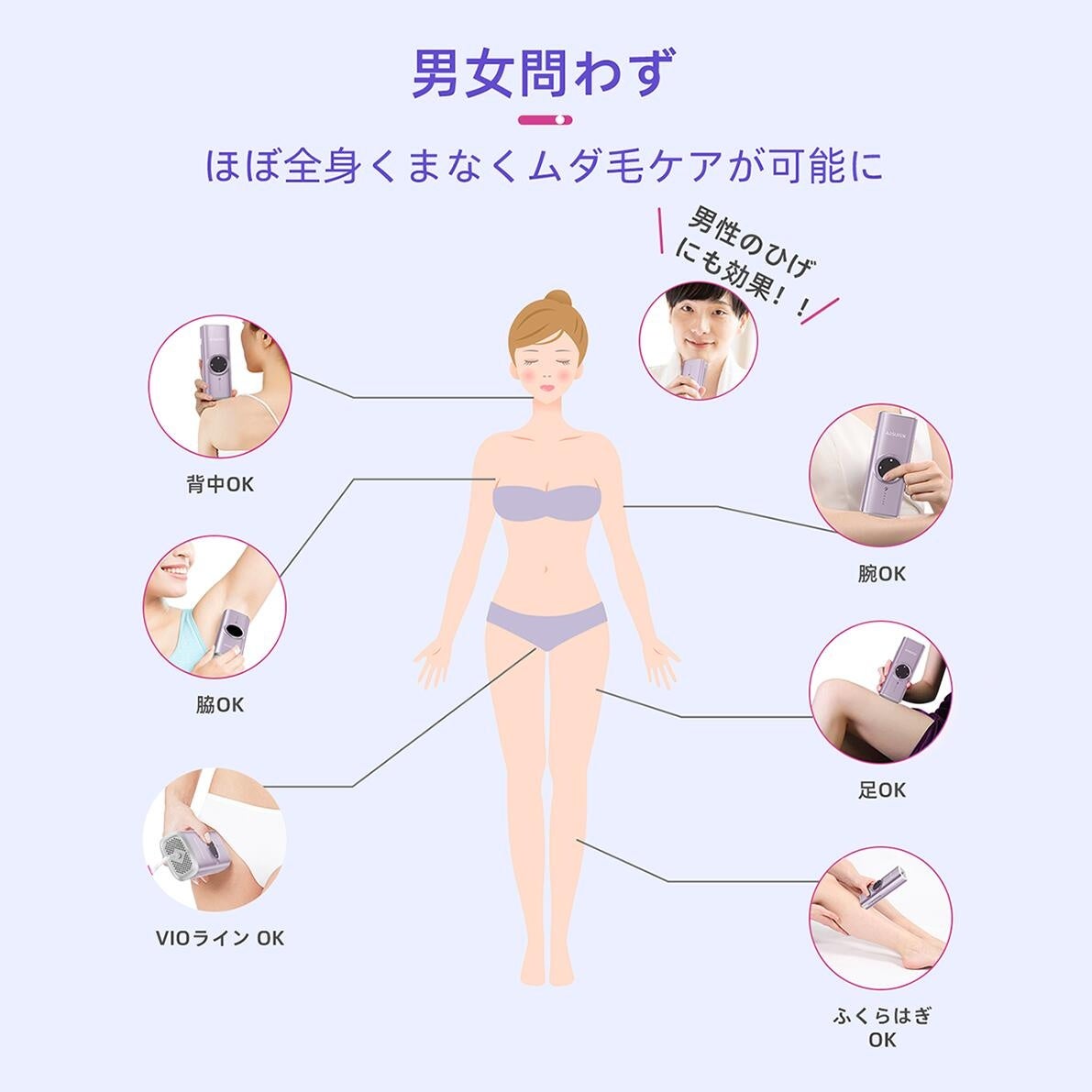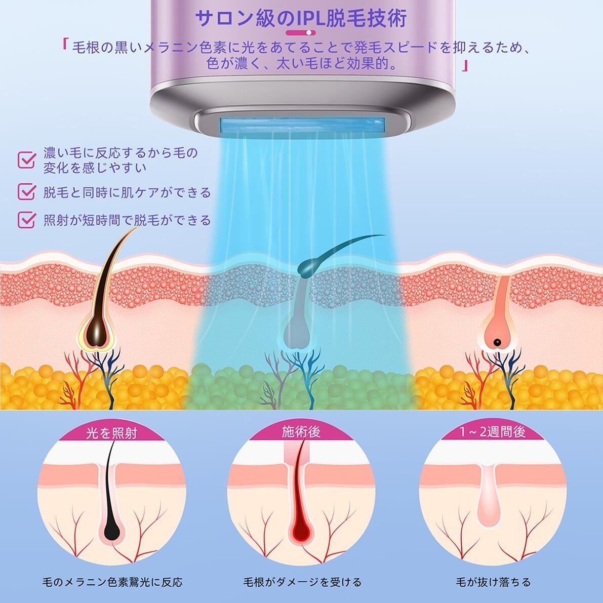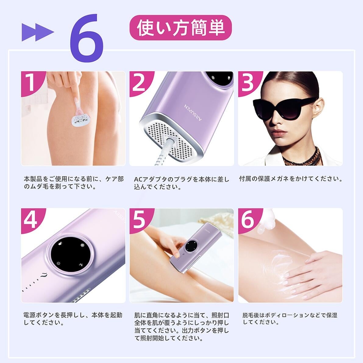 自宅で手軽にサロン級の脱毛体験ができる家庭用脱毛器です。最新のハイパーIPL技術を採用し、痛みを感じにくく、ムラなくケアができます。さらに、冷却機能を搭載しており、肌の熱を緩和して痛みを軽減。5段階の照射レベルで肌色や好みに合わせた設定が可能で、自動連続照射モードも搭載されています。上品なライトパープルのデザインも魅力的です。