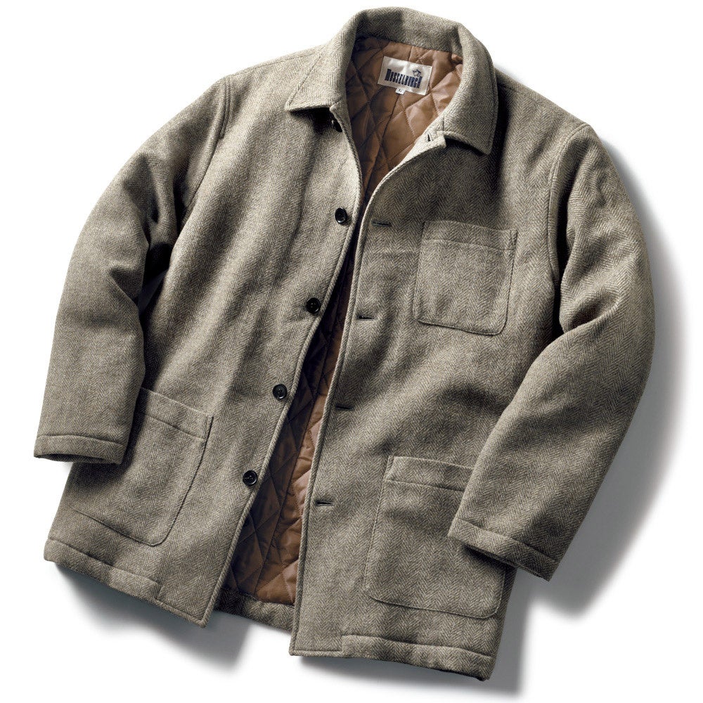 英国の羊毛を100%用い、その持ち味である弾力性に富んだふっくらとした毛質を活かしながら、日本有数の毛織物産地である尾州で丁寧に織り上げた上質な生地を使用。内側には中わた入りのダイヤキルトを配し、保温性を高めています。デザインは、流行に左右されることのないオーセンティックなカバーオール。伝統的なヘリンボーンの織り柄が映えるクラシックな佇まいが、紳士の装いに品格を添えます。