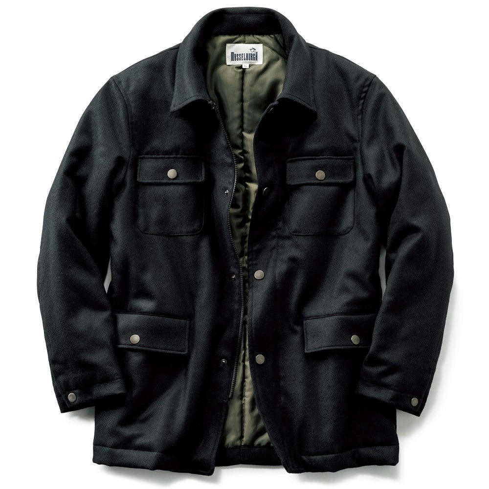 ミリタリーファッションの定番品であるフィールドジャケットをベースに、シッ クなブラックのフラノ生地で上品な雰囲気に仕上げた一着です。毛羽の少ない梳毛糸とカシミヤ混の紡毛糸を交織した生地は、ふっくらと柔らかく軽やか。適度なストレッチ性も備えます。中わた入りの保温力や大型ポケットの収納力など、行動的な旅を後押しする機能的なジャケットです。