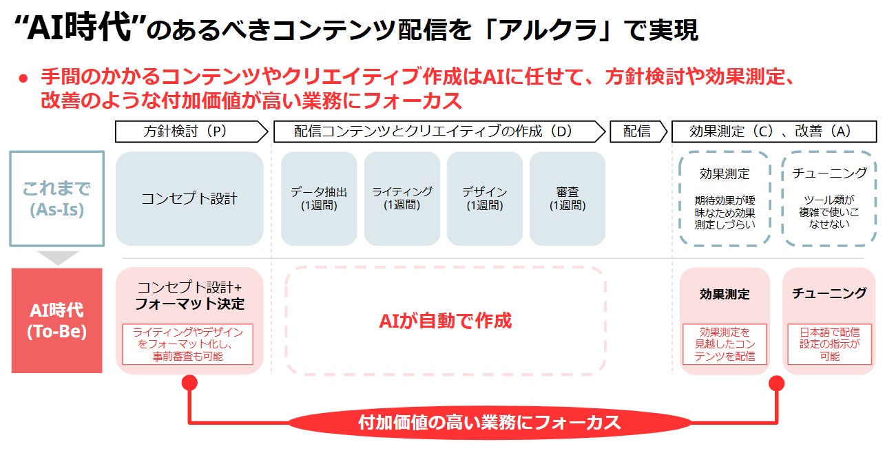 クリエイティブ制作者としては、あらかじめフォーマットやコンセプトを決めておくことで、データサイエンティストとしての「アルクラ」が出力したコンテンツを自動で埋め込み、バナーやLPを自動で生成します。
