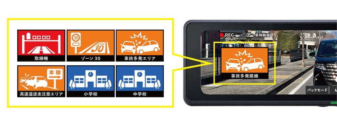 ドライブ中の危険なエリアを警告音と画面で事前におしらせ。取締機や安全運転ポイントなど役立つ情報をお伝えします。