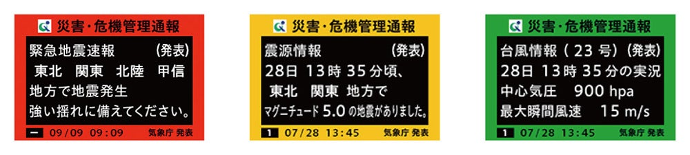 ※災危通報は気象庁発表からの理論上の最大遅延時間や電波受信状況により遅延が生じるため、他の機器(携帯電話など)で受信されるタイミングとは一致しません。