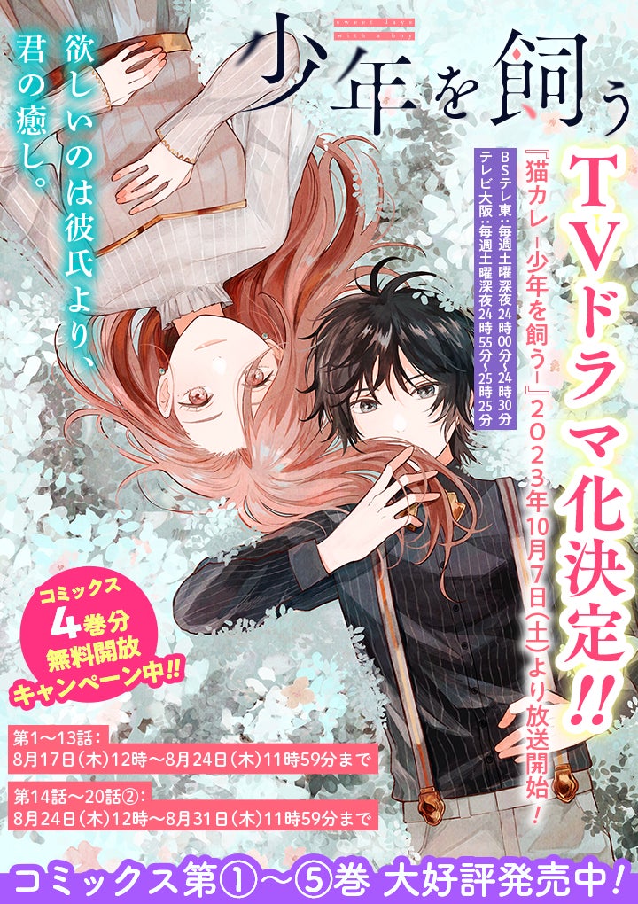株式会社コアミックス(東京都武蔵野市)は、WEBゼノン編集部にて、TVドラマ化が発表された「猫カレ -少年を飼う-」の原作『少年を飼う』の無料開放キャンペーンを実施いたします。