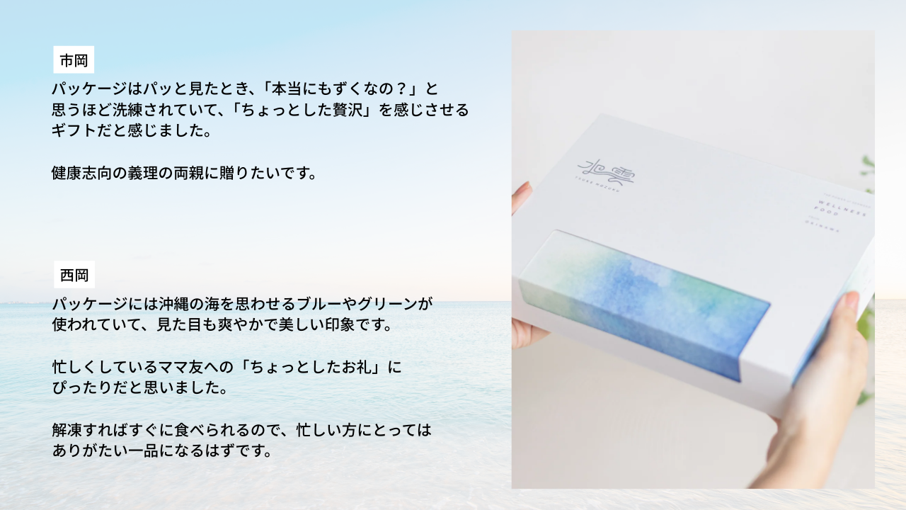 また、健康を意識した食材でありながら、見た目にも上品で特別感があることから、「ちょっとしたお礼」や「健康志向の方への贈り物」としても選びやすい商品だという意見もいただきました。