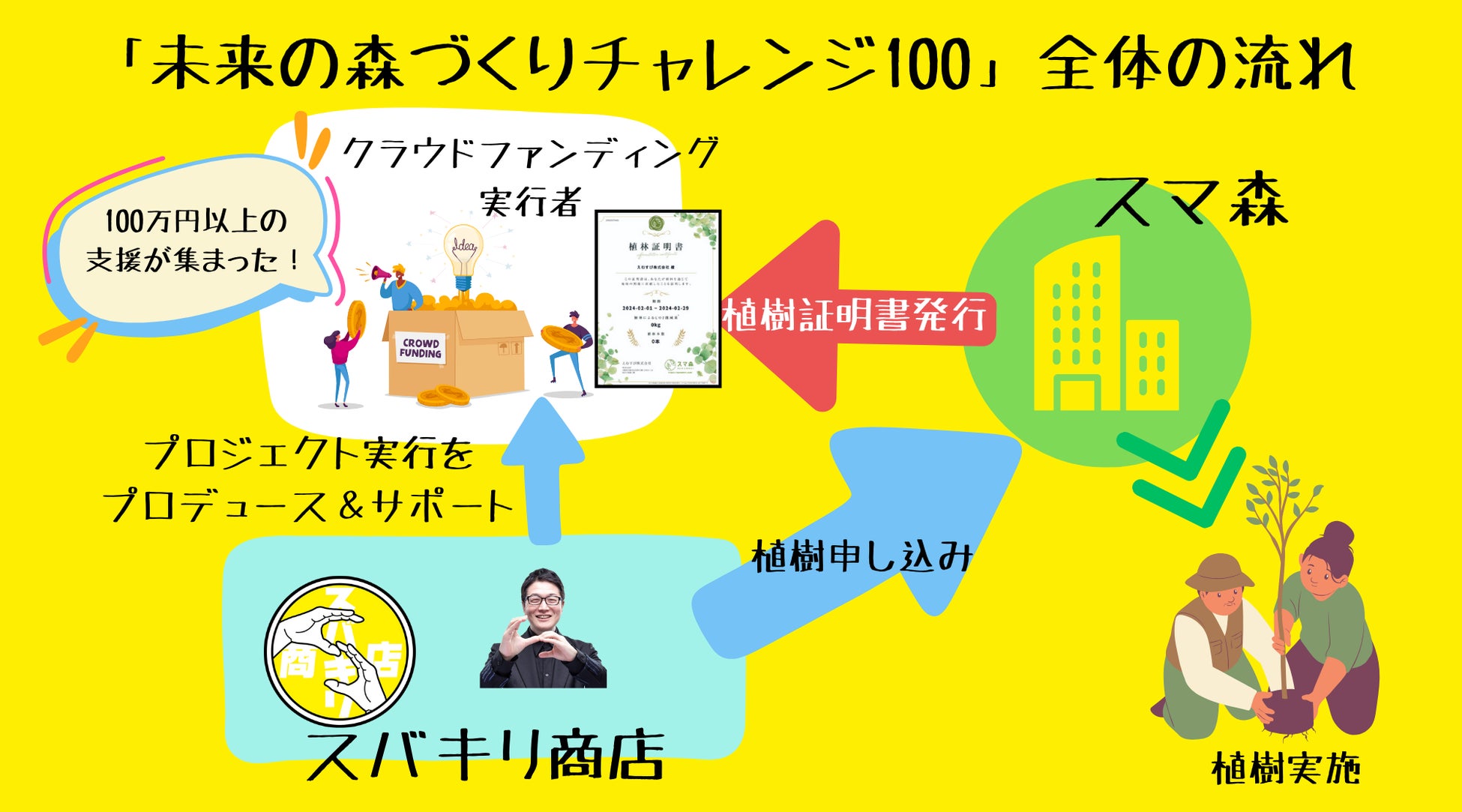 「未来の森づくりチャレンジ100」では、スバキリ商店株式会社がプロデュースする全てのクラウドファンディングプロジェクトにおいて、100万円以上の支援金額を達成したプロジェクト1件につき、1本の木を植樹する活動を実施します。