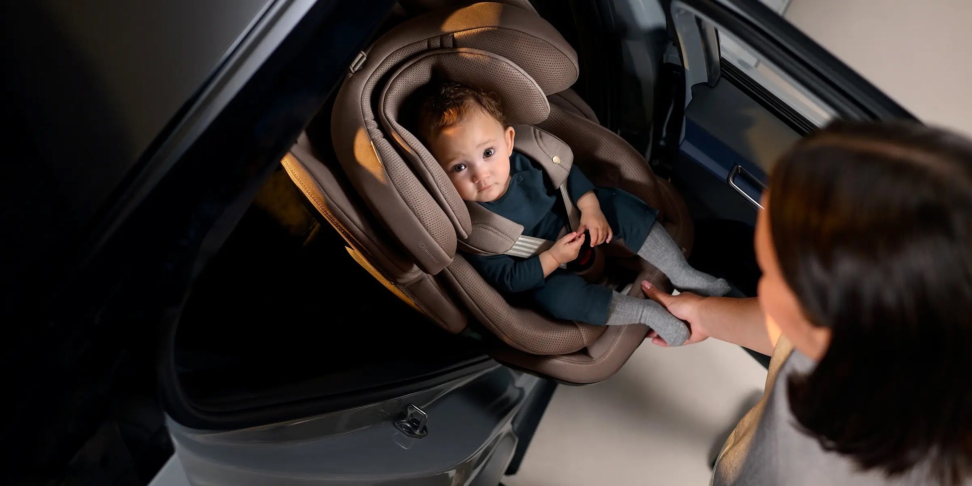 Emerald 360 Proの最大の特長は、チャイルドシート本体がドア側へスライドすることにより、シートがドア側へせり出す構造です。従来のチャイルドシートと比較して、乗せ降ろし時に姿勢を大きく崩すことなく、腰や背中にかかる負担を軽減しながらスムーズにお子様を乗せ降ろしできます。特に、低床の車両や小柄な保護者にとっても操作しやすく、日常のストレスを軽減します。