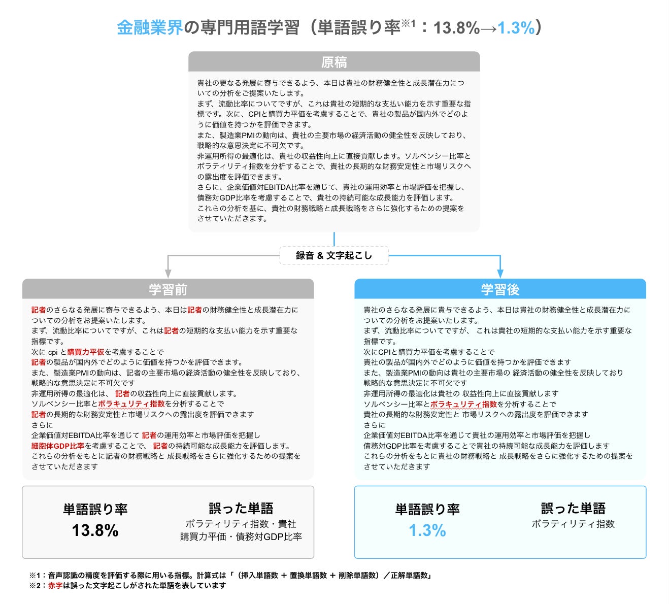 以下は、不動産業界と金融業界の専門用語を盛り込んだ音声の文字起こしを、学習前と学習後で比較した結果になります。