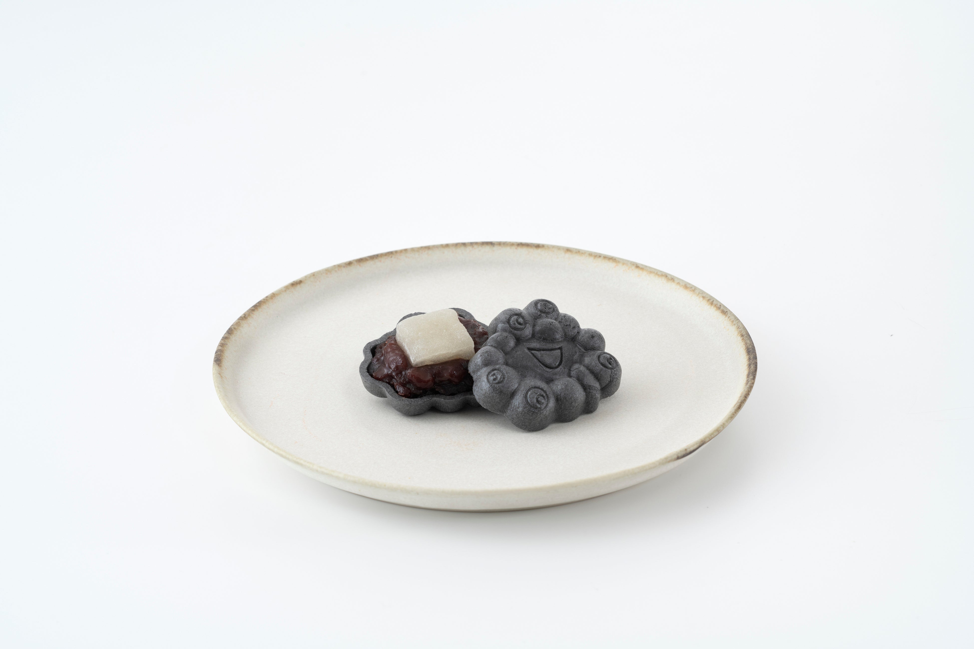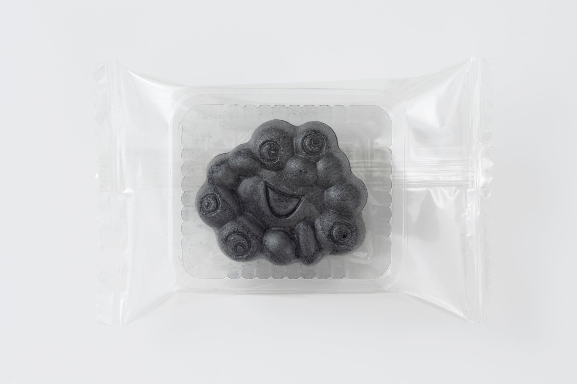 黒ミャクミャクを表現するためには、炭末(たんまつ)と呼ばれる植物性の黒い天然色素を用いました。炭末は無味無臭のため、もなかの味には影響いたしません。どうぞ安心してお召し上がりください。