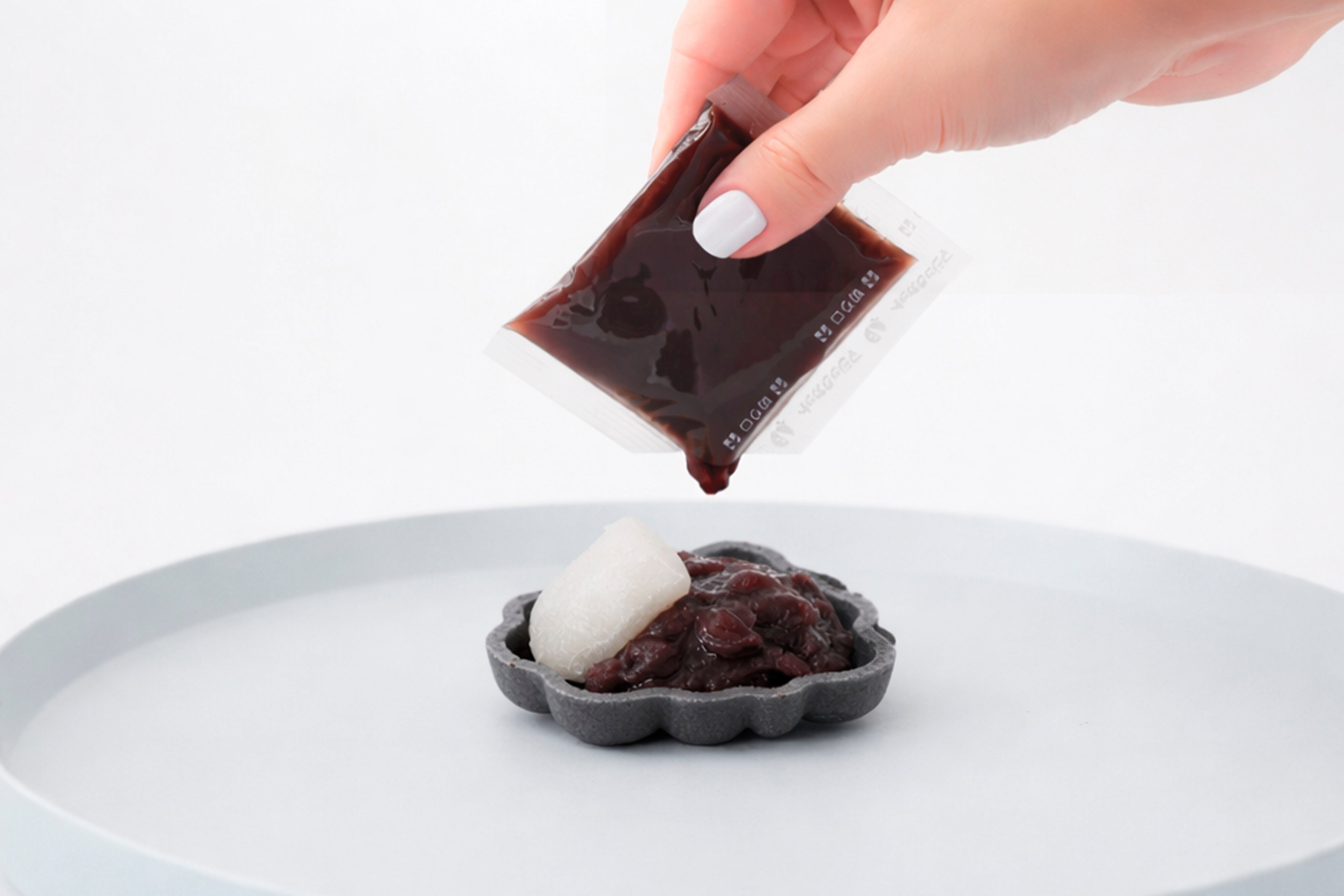 『ミャクミャク黒もなか』は、お手づくりタイプですので、お客様自身で粒あんとお餅をはさんでいただき、できたてのもなかをお楽しみいただけます。一手間かけることで、国産餅米の香ばしい風味はもちろんのこと、サクサクとした軽い食感とたっぷり入った北海道小豆粒あん、さらにやわらかなお餅の相性の良さを存分に味わってください。