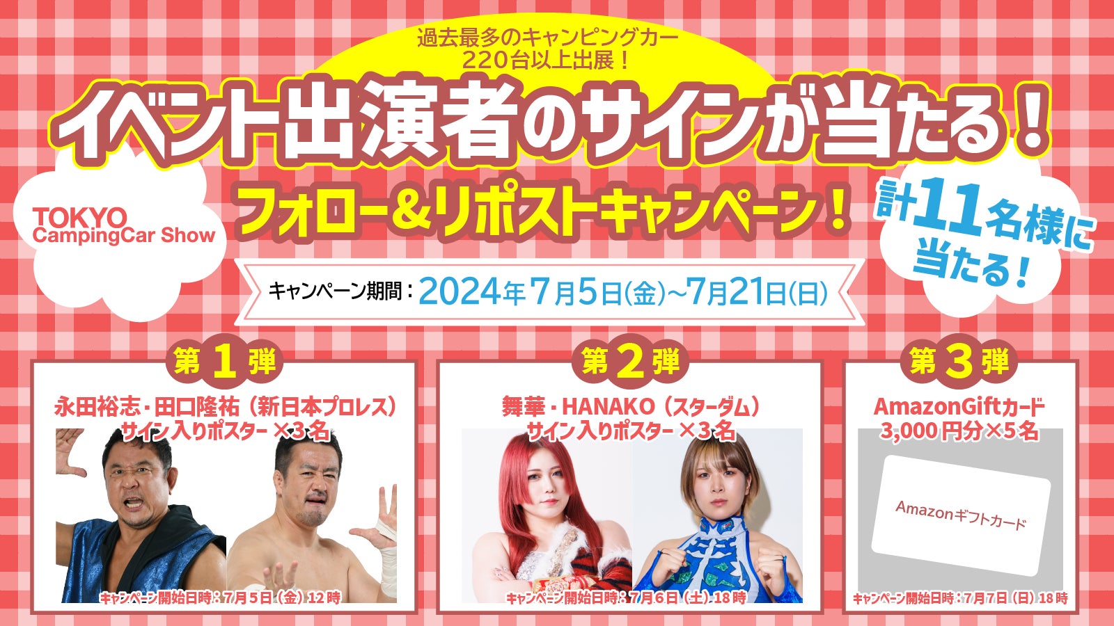 テレビや舞台など多岐にわたり大活躍中人気タレントの野々村真、自身でキャンピングカーを持ちJRVA公式親善大使・女優の田中美奈子、人気プロレス団体『新日本プロレス』より永田裕志・田口隆祐、『スターダム』より舞華・HANAKOなどの出演が決定。
