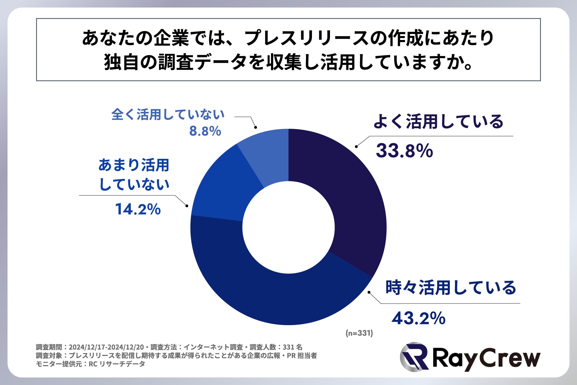 また、「プレスリリースの作成にあたり、企業で独自の調査データを収集し活用しているか」を尋ねる設問の回答では、「時々活用している」が最も多く43.2%、次に「よく活用している」が33.8%で続く結果となりました。1位と2位の回答を合計すると回答率は77%となり、プレスリリースで期待する成果を得られている企業の大半が、プレスリリースの作成にあたり、独自の調査データを収集し活用している、ということが判明しました。