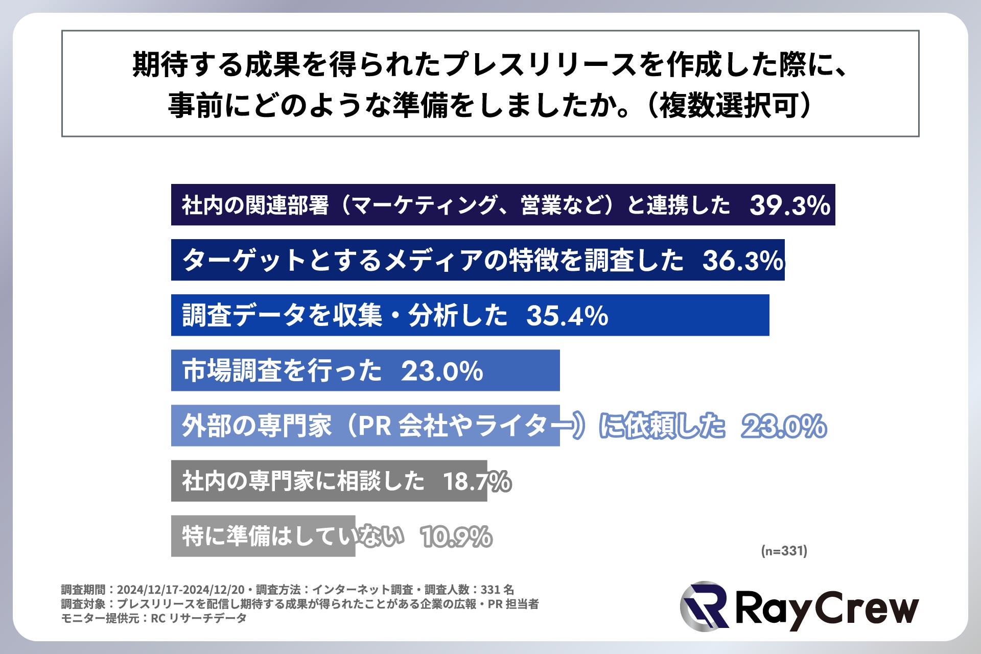 続いて「期待する成果を得られたプレスリリースを作成した際に、事前にどのような準備をしたか」を尋ねる設問への回答では、1位が「社内の関連部署(マーケティング、営業など)と連携した」で39.3%、2位が「ターゲットとするメディアの特徴を調査した」で36.3%、3位が「調査データを収集・分析した」で35.4%という結果になりました。この結果から、社内で連携してプレスリリースを作る動きをした際や、プレスリリースの読み手であるメディアが望むもの考えた際、また、調査をして独自の調査データというニュースバリューをつくれた際などに、プレスリリースで成果を残すことができたケースが多い、ということが明らかになりました。