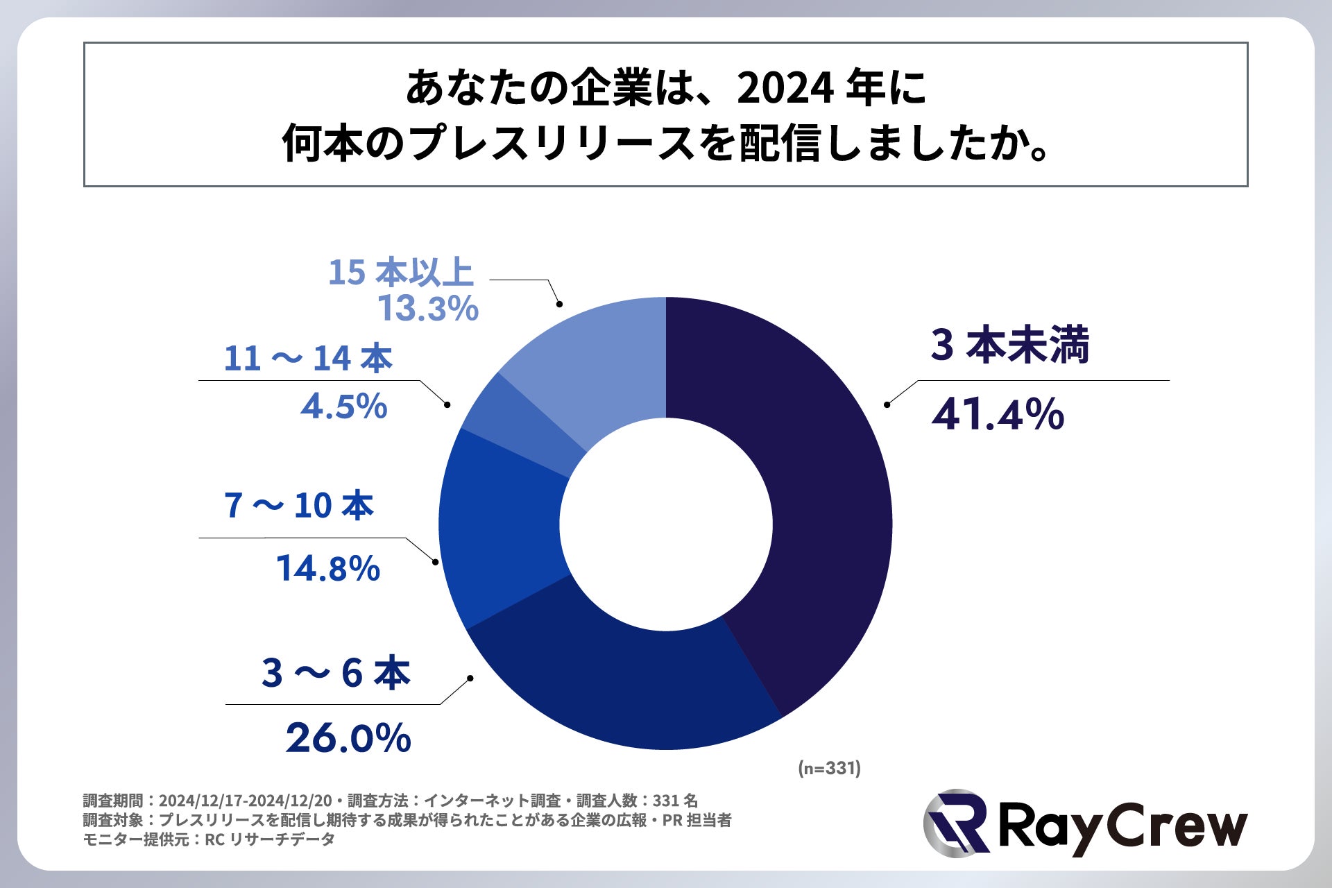 まず、「企業として2024年に何本のプレスリリースを配信したか」を尋ねる設問への回答で最も多かったのは1位が「3本未満」で41.4%、2位が「3~6本」で26.0%、3位が「7本~10本」で14.8%という結果になりました。この結果から、プレスリリースの配信本数の多さとプレスリリースによる成果が比例しているわけではないことが明らかになりました。