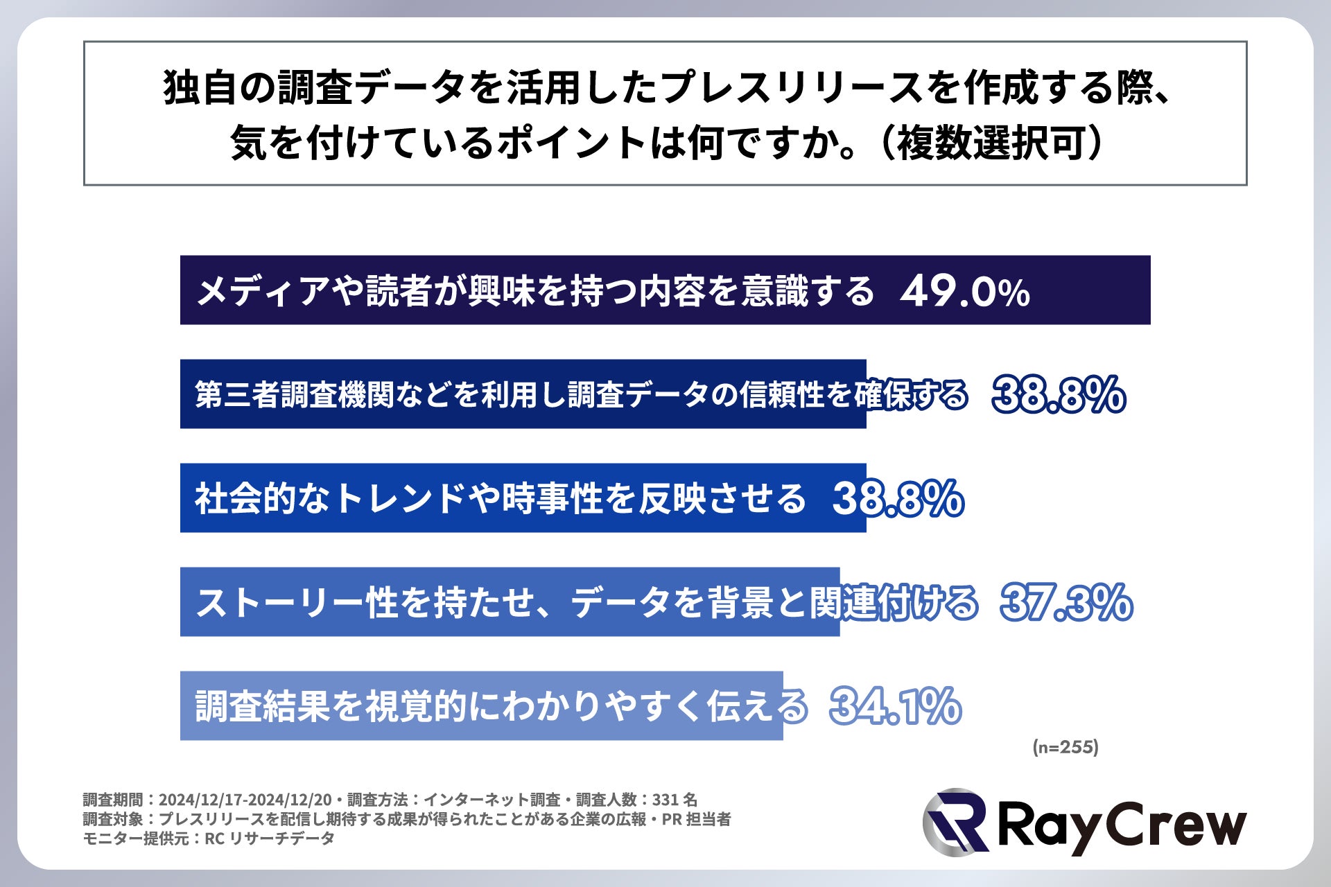 調査の最後、プレスリリースの作成にあたり、企業で独自の調査データを収集し活用している(「時々活用している」を含む)と回答された方に「独自の調査データを活用したプレスリリースを作成する際、気を付けているポイント」を問う設問への回答では、1位が「メディアや読者が興味を持つ内容を意識する」で49.0%、2位が同率で「第三者調査機関などを利用し調査データの信頼性を確保する」と「社会的なトレンドや時事性を反映させる」が38.8%で並ぶ結果となりました。この結果から、調査データを活用したプレスリリースでもメディアやメディアの先にいる読者といった「読者視点」が重要であることがわかりました。
