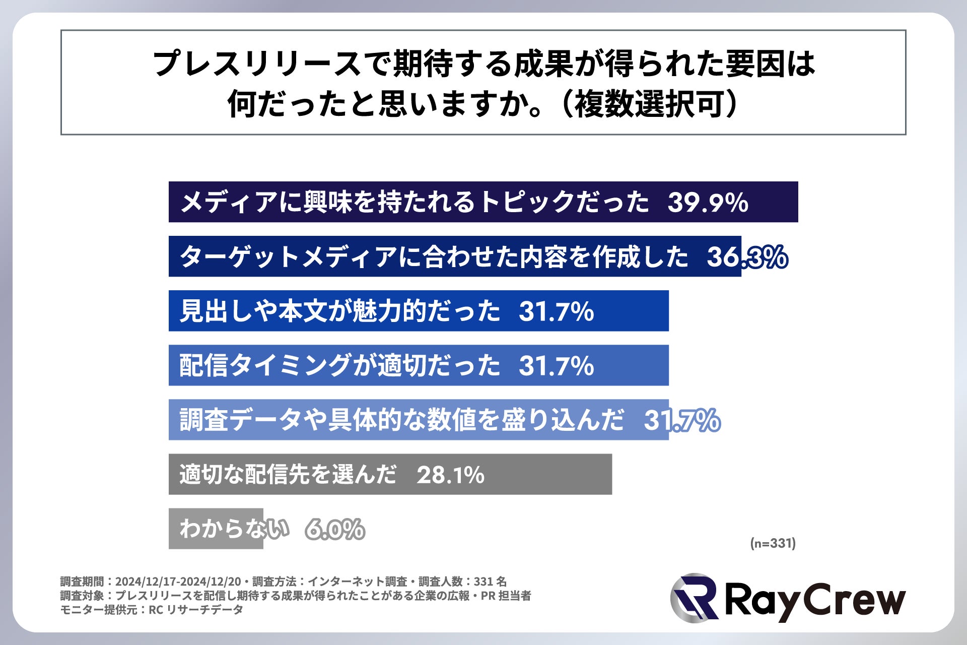 次に「プレスリリースで期待する成果が得られた要因」を問う設問の回答では、1位が「メディアに興味を持たれるトピックだった」で39.9%、2位が「ターゲットメディアに合わせた内容を作成した」で36.3%という結果になりました。この結果から、企業目線ではなく、メディア目線で作成したプレスリリースが期待する成果を得られた要因と考える方が多いということがわかりました。