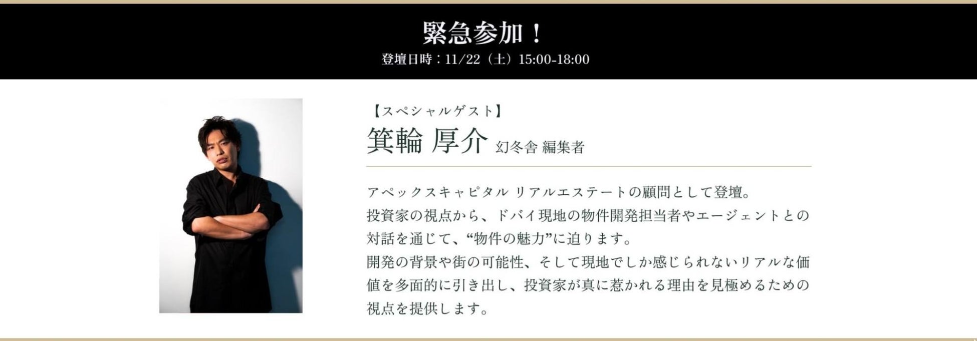 ドバイ不動産仲介業を手がけるApex Capital Real Estate(アペックスキャピタル リアルエステート、以下「アペックスキャピタル」)は、幻冬舎編集者・実業家として活躍する箕輪厚介(みのわ こうすけ)氏が当社の顧問に就任したことをお知らせいたします。また顧問就任を記念し、11月22日(土)開催のドバイ不動産セミナーへの登壇も緊急決定しました。