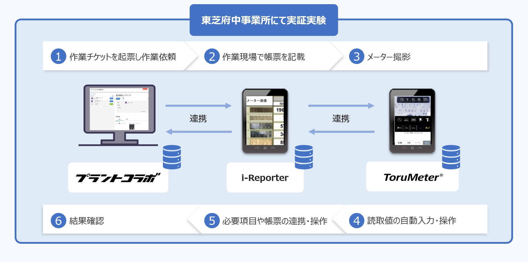 NTTドコモビジネス株式会社(本社:東京都千代田区、代表取締役社長:小島 克重、旧 NTTコミュニケーションズ株式会社、以下 NTTドコモビジネス)、NTTドコモソリューションズ株式会社(本社:東京都港区、代表取締役社長:三ケ尻 哲也、旧 NTTコムウェア株式会社、以下 NTTドコモソリューションズ)、株式会社東芝(本社:東京都港区、代表取締役社長 執行役員 CEO:島田 太郎、以下 東芝)は、東芝府中事業所にて、NTTドコモソリューションズが提供する「プラントコラボ※1」と、東芝が提供する「ToruMeter®※2」を連携させ、設備の保全・点検業務での人為的ミスの低減や作業の効率化、省人化を図る実証実験(以下 本実証)を実施しました。本実証により、点検作業の業務効率化およびコスト削減の効果を確認しました。この結果をふまえ、工場など現場のDXを実現するサービスの提供を本日より開始しました。