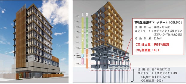 木造ハイブリッド構造の自社寮に環境配慮型BFコンクリート「CELBIC」を採用