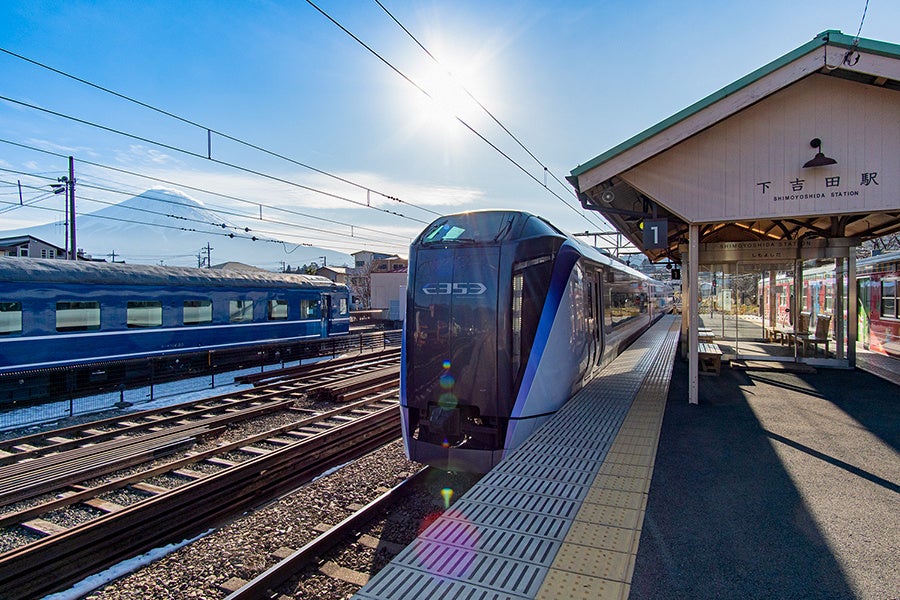 富士急行線を運営する富士山麓電気鉄道株式会社との連携では、下吉田駅の駅舎を展示会場として使用します。下吉田駅は、工業デザイナー水戸岡鋭治によるデザインが目を引く印象的な駅舎で、日本を代表する景観である「新倉山浅間公園・忠霊塔」にも近く、海外からも多くの観光客が訪れます。