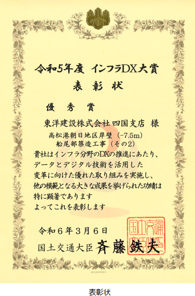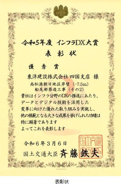 東洋建設株式会社(代表取締役社長 大林 東壽)は、国土交通省による「インフラDX大賞」において「優秀賞」を受賞し、2024年3月6日に堂故 茂(どうこ しげる)国土交通副大臣より表彰状を頂きました。