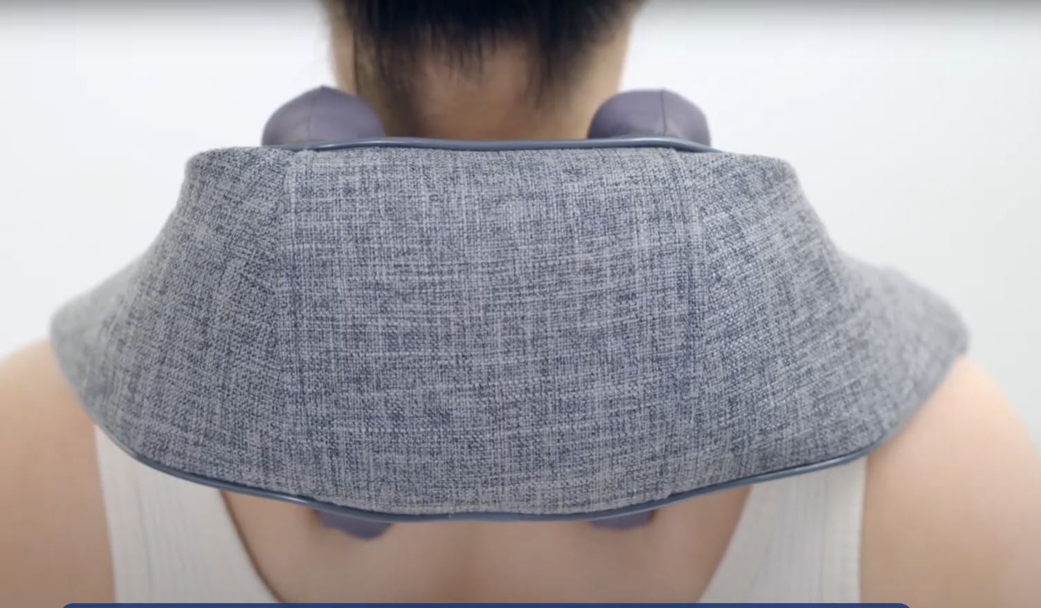 4 つのもみ⽟で⾸を挟む構造に加えて、2 つのもみ⽟で肩甲⾻も同時にケアします。合計6つのポイントで⾸回りを加圧、温熱と合わせて⼼地よくマッサージします。