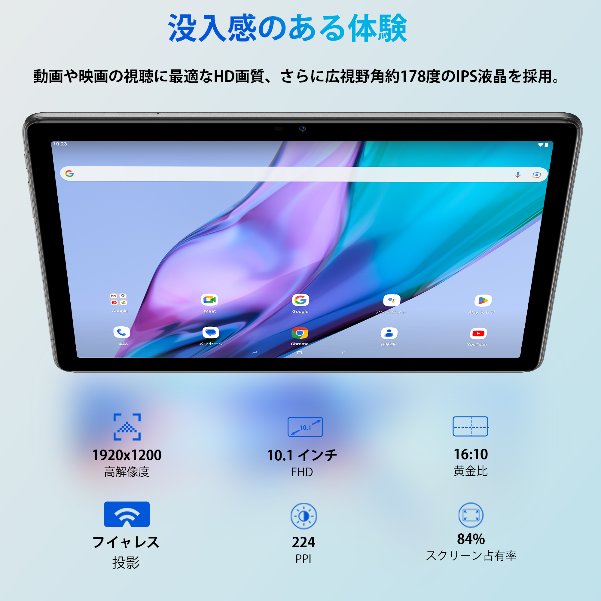 液晶画面は、1920x1200のフルHDディスプレイで、IPS液晶を搭載し、Incell全貼り工芸を採用しています。通常のフルHDディスプレイよりもさらに美しい映像が堪能できます。また、TÜV認証を取得しており、目に優しい画面で長時間使用しても疲れにくく安心です。僅か8.4mmの薄さと563gの重さ、薄くて軽い高級感のあるメタルボディ。また16:10のアスペクト比により、心地よい動画の視聴やウエブサイトの閲覧などをお楽しみいただけます。