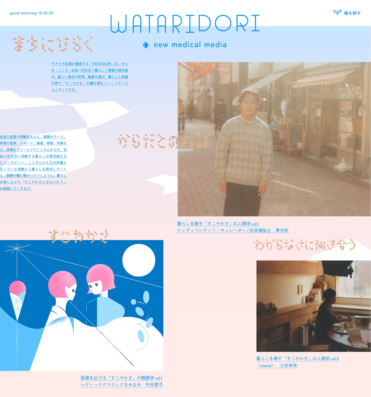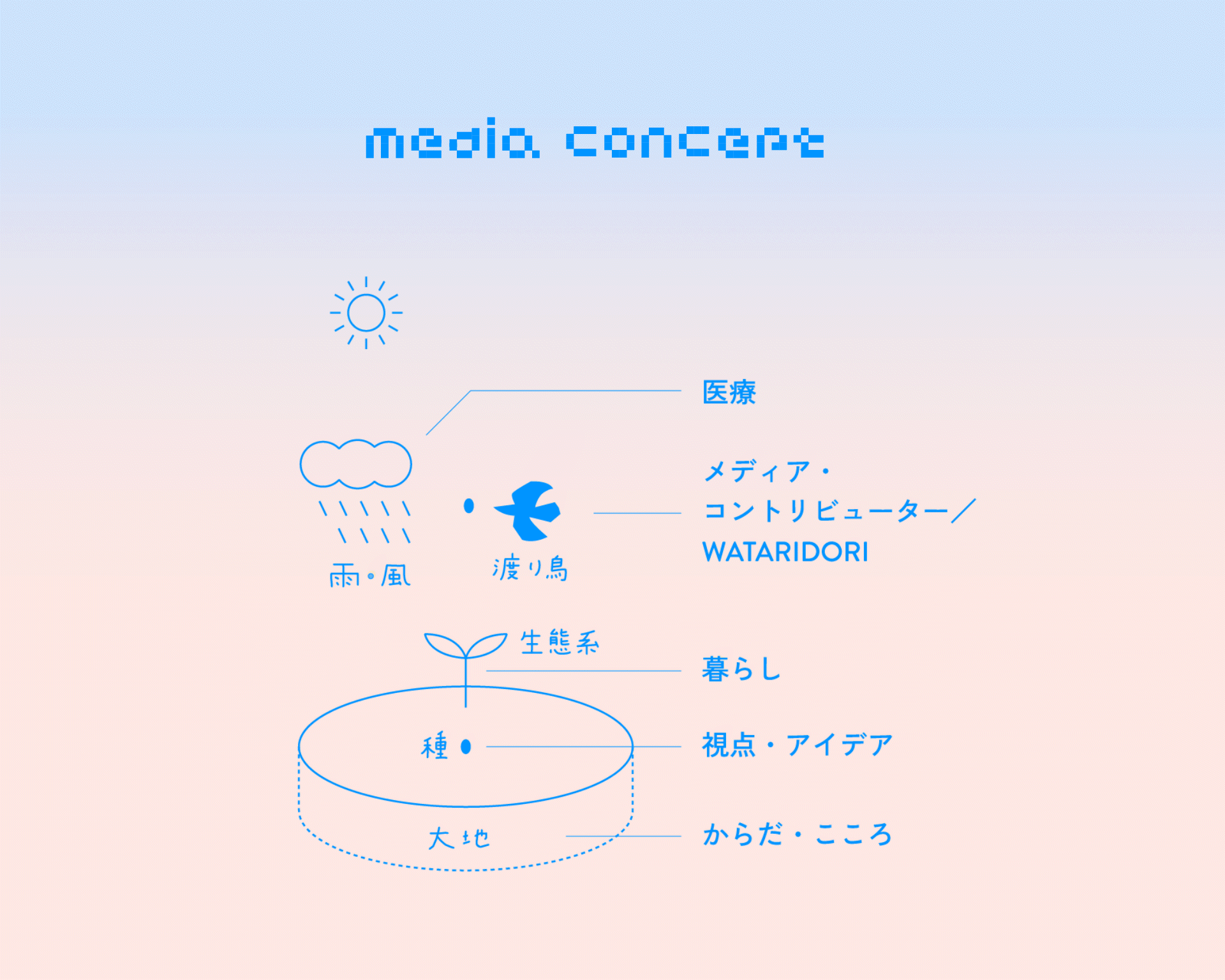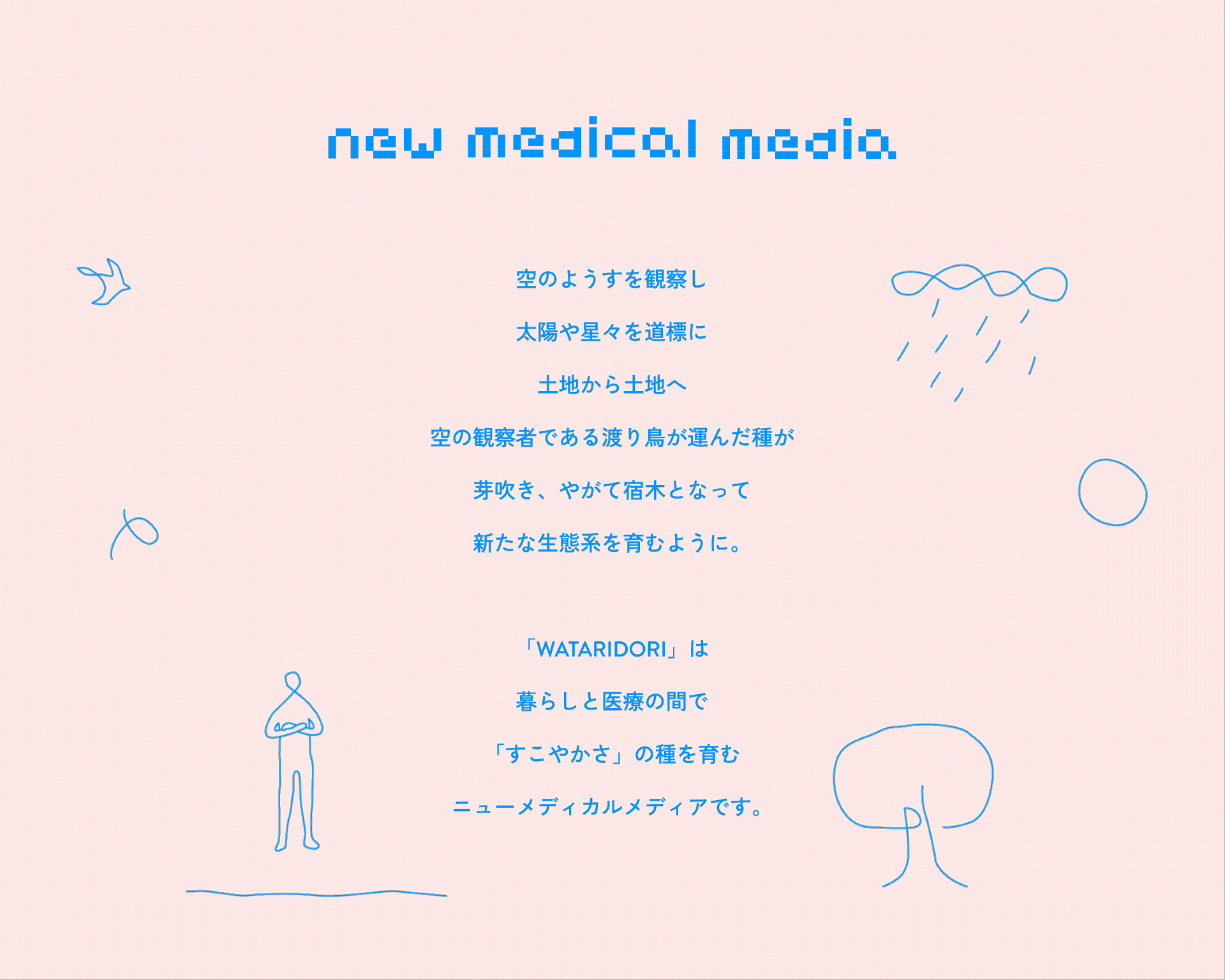 「WATARIDORI」では「今日をすこやかさに生きるヒント」を探し求めて、自身の身体感覚や経験をもとに建築やアート、料理や音楽、スポーツ、農業、映画、写真など、多様なフィールドでこころとからだ、社会に向き合い活動する暮らしの探求者たち。そして日々医療現場に向き合いながら暮らしをまなざす医療の探求者たちに話を伺います。土地から土地へ、太陽の動きや星々の位置を頼りに自らの道を見つけていく渡り鳥によって運ばれた種が、やがて宿木となって新たな生態系を育むように。暮らしと医療、双方の視点から「すこやかさ」を紐解く種を届けていきます。