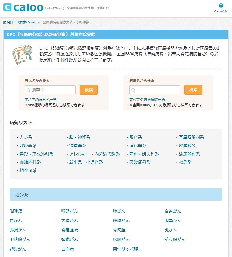 DPC対象病院実績(全国病院別治療実績検索):https://caloo.jp/achievements/