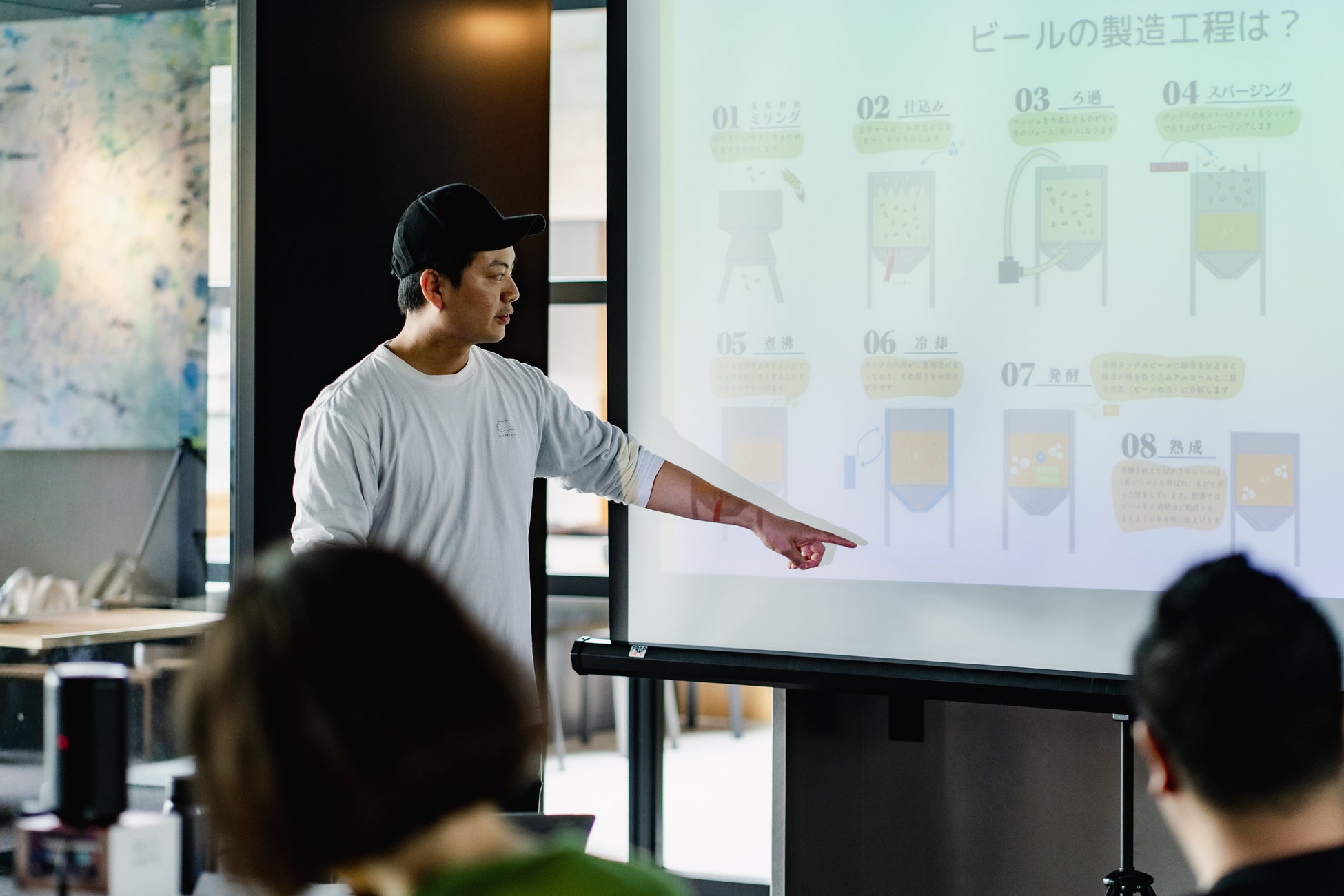 第1回目となる講座は、今回製造していただく醸造所「OUR BREWING」の岡田さんからOUR BREWINGの紹介やクラフトビールの製造方法や基礎知識をレクチャー。また、実際にOUR BREWINGのビールを試飲しながら知識を深めていきました。