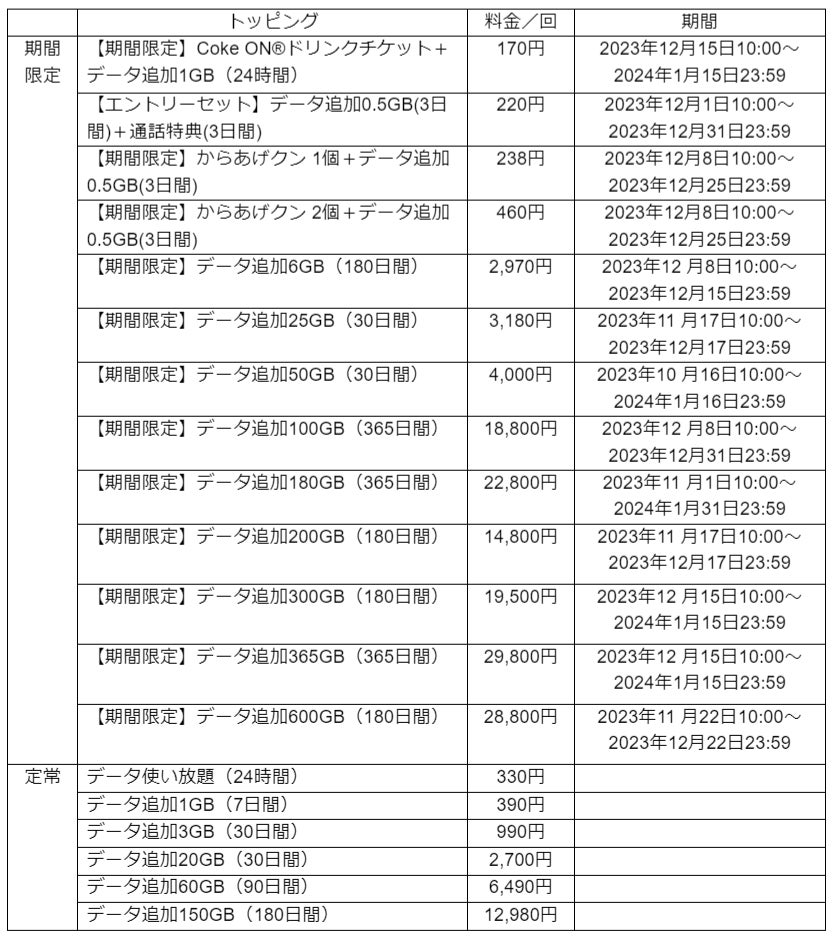 (参考)提供中のデータトッピング一覧(2023年12月15日時点)