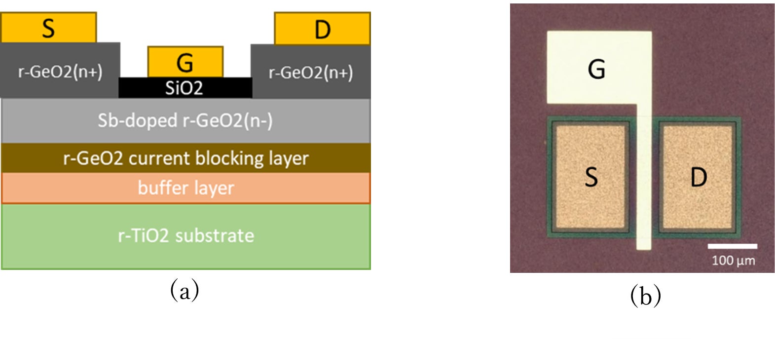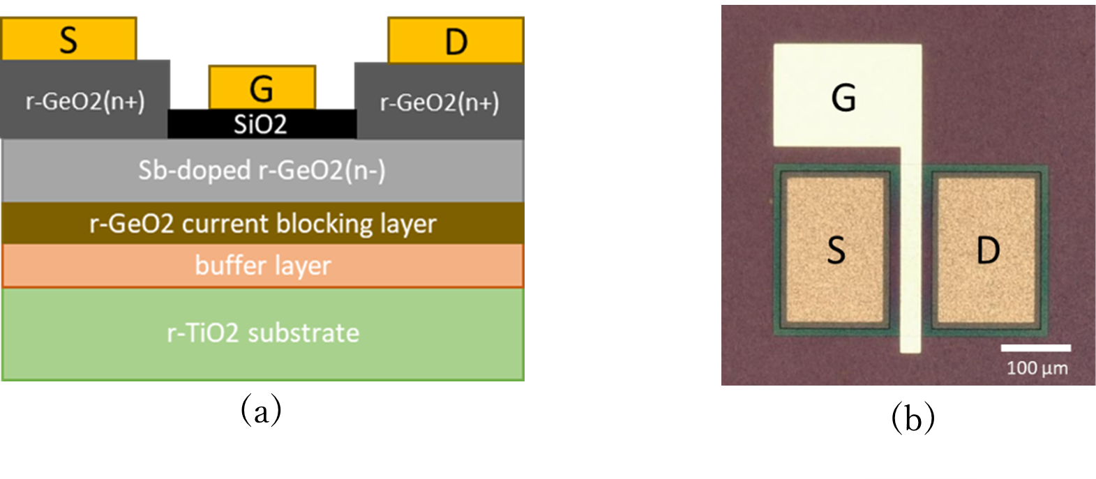図1:r-GeO₂ MOSFETの(a)断面模式図と(b)光学顕微鏡像