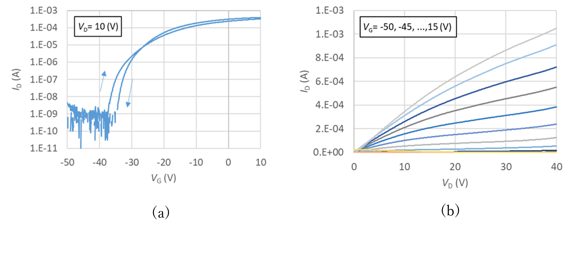 また、図2(b)に示すID-VD特性からは、ドレイン電圧Vdの増加に伴い、線形から飽和特性へと移行する典型的な特性が確認されました。