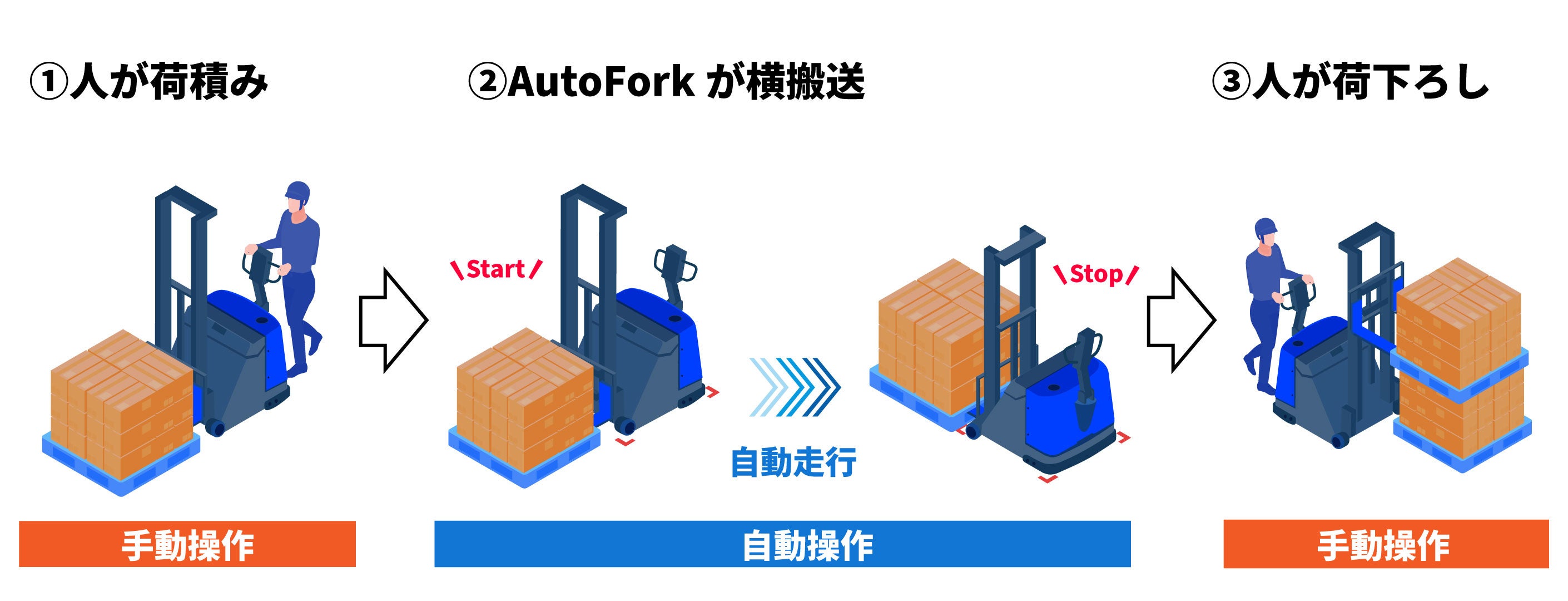 作業者が始点にてAutoForkをマニュアル操作し、パレットを持ち上げた状態で所定の位置から自動搬送を開始すると、AutoForkはルートを自動走行し、荷下ろし場所付近の目的地点まで搬送します。終点では、作業者がマニュアル操作へ切り替えてパレットを荷下ろしします。
