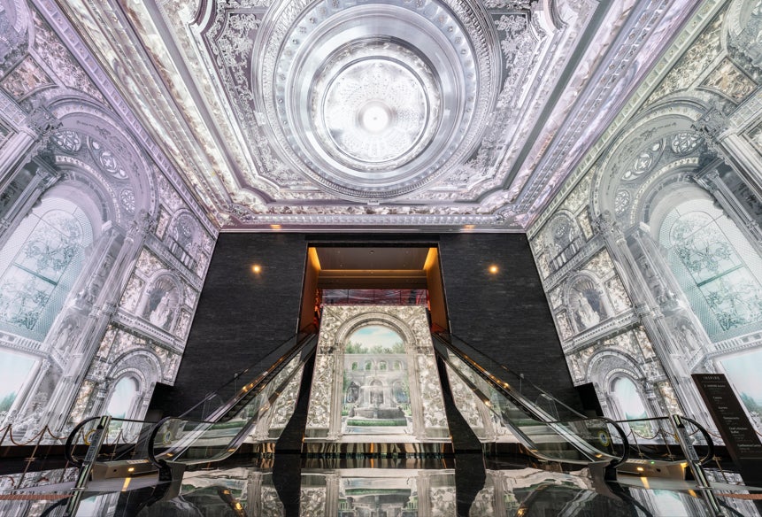 オーロラへと続くエントランスエリアの「キューブ」は、「クリスタル・パレス」をテーマに近代の宮殿を彷彿させる透明で光り輝く空間へと変貌します。入口正面の大型LEDスクリーンを埋め尽くす壮麗なシャンデリア、左右の壁に施された繊細なアーチや様々なオブジェ、そして天井の巨大なドームが、多視点から立体的に見える、フォトジェニックな空間を演出します。