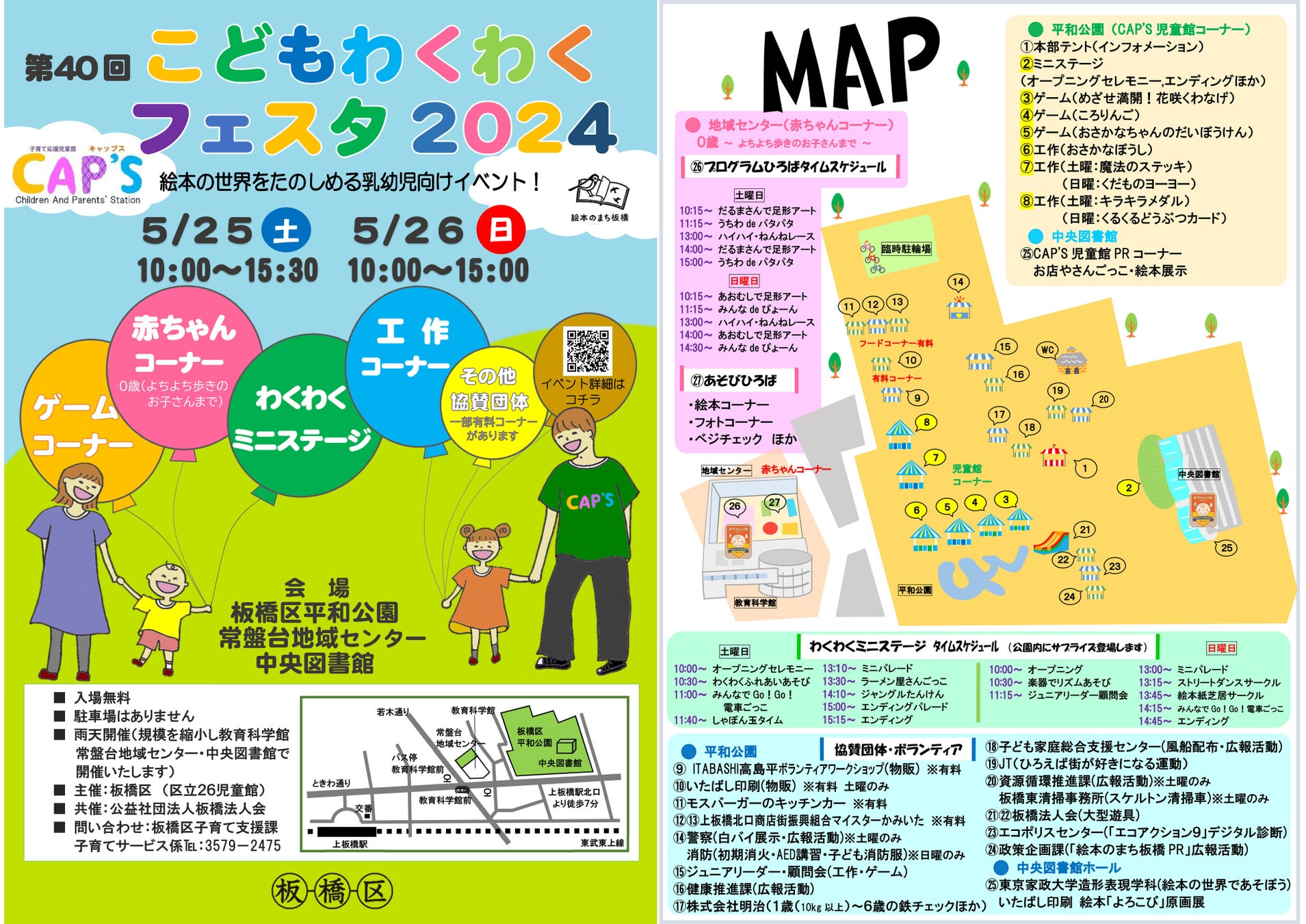 令和6年5月25日(土)・26日(日)の2日間、板橋区の子育て応援児童館CAP'Sの総力を結集した子どもの祭典『こどもわくわくフェスタ2024』を開催します。今回で40回目を迎えます。